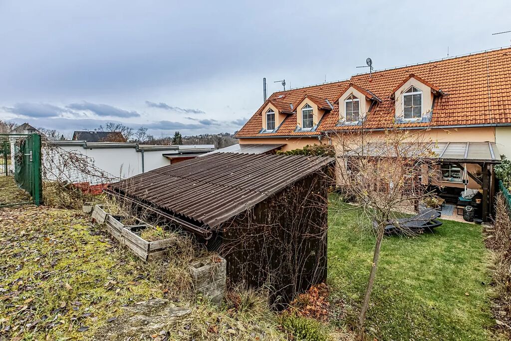 Za domem se nachází zahrada o výměře cca 100 m² s pergolou, zahradním posezením, grilem a dětskou trampolínou. K dispozici je také zahradní domek s úložným prostorem (kola, sekačka apod.).