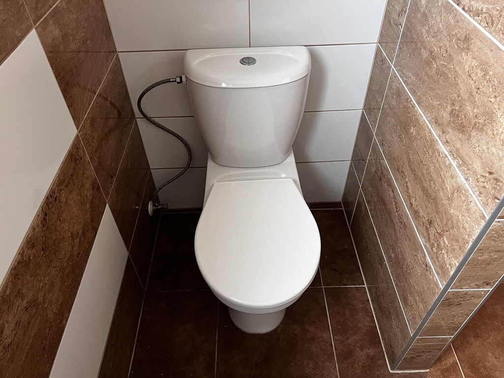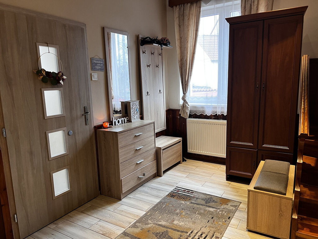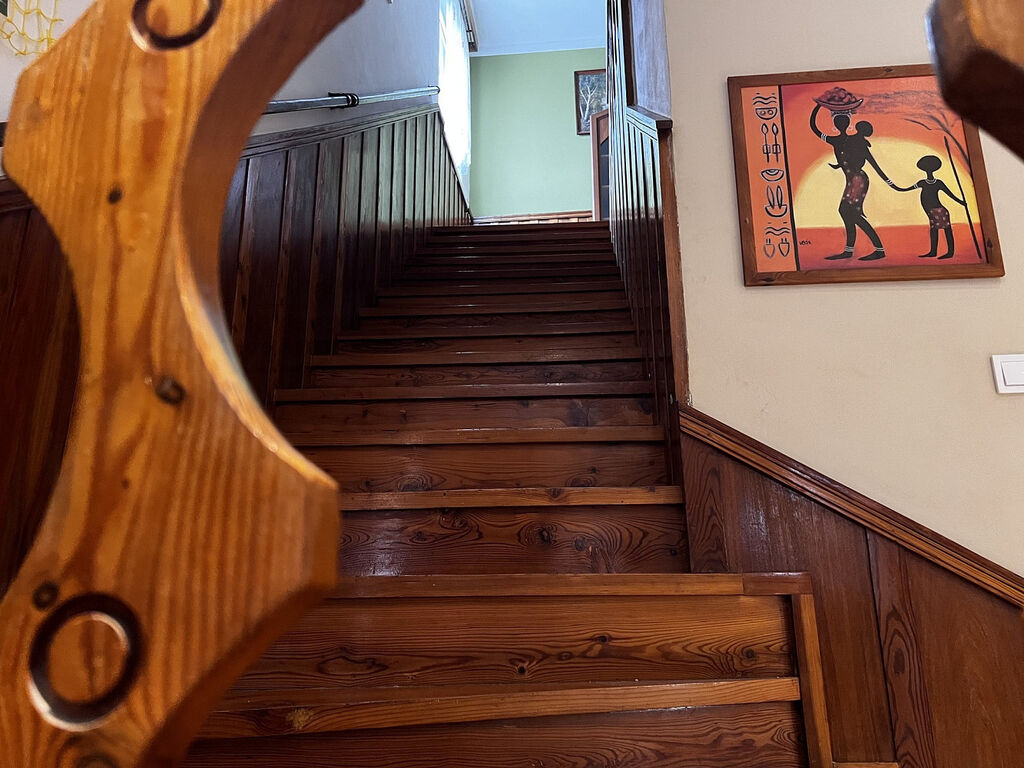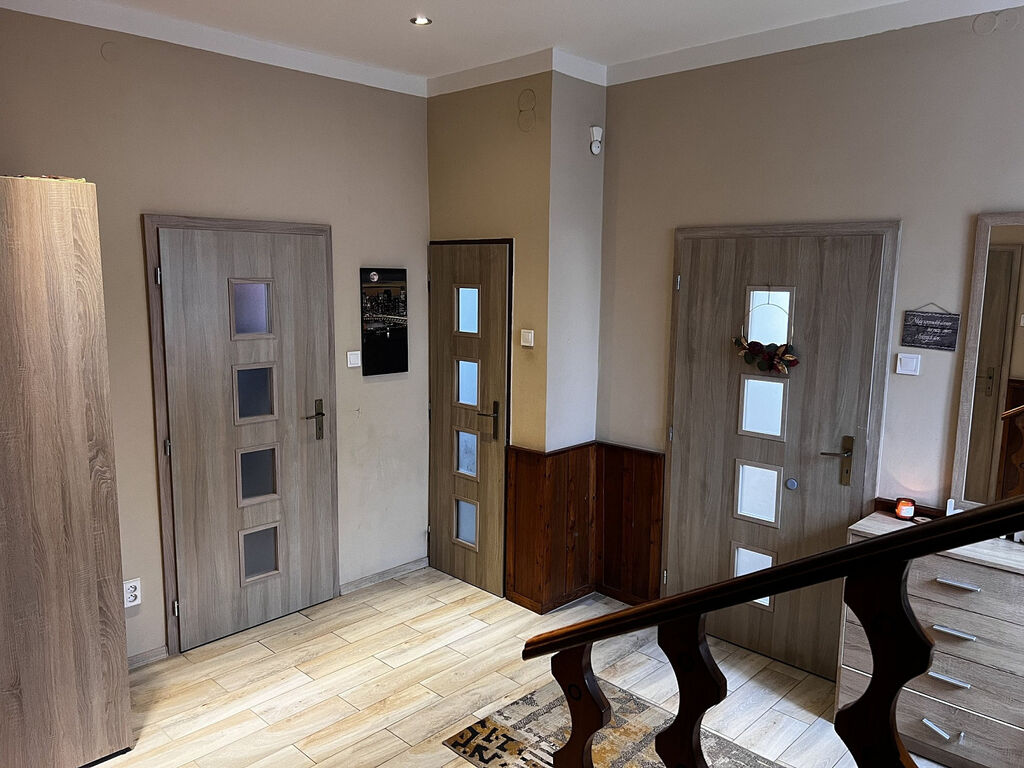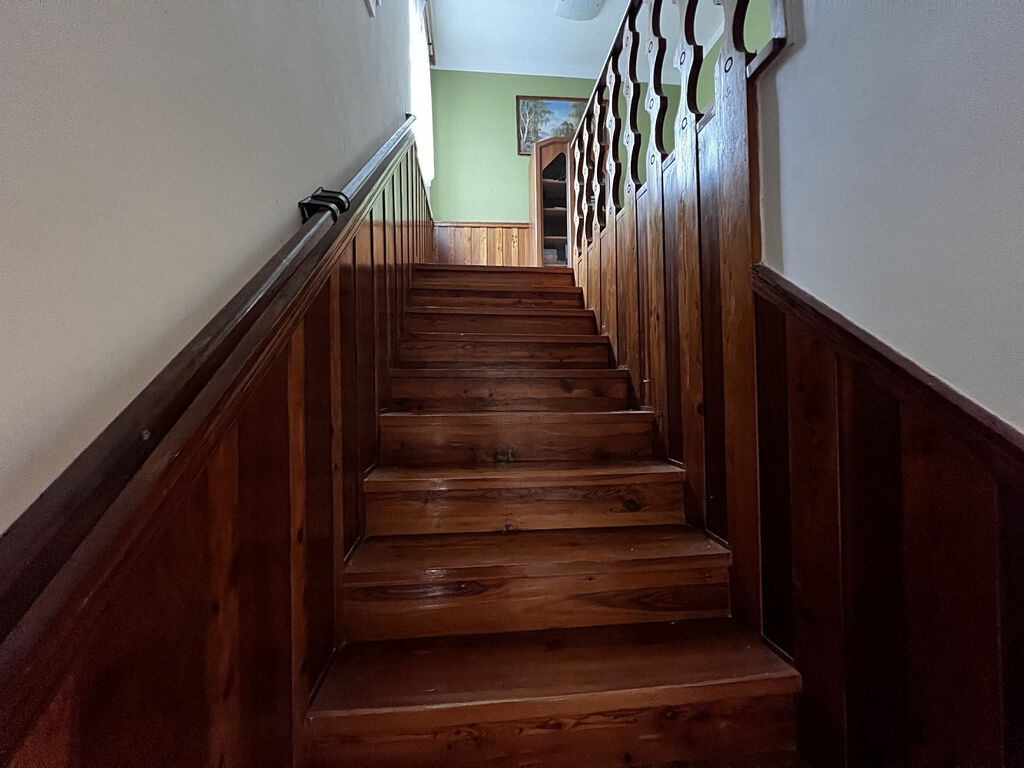 Do patra domu se jde po původním dřevěném schodišti, zde jsou další tři pokoje a druhá koupelna s vanou, umyvadlem a s WC. Do domu se vchází ze zadní části od zahrady.