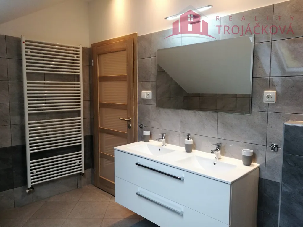 Ve 2 . NP je chodba, ložnice, velká koupelna s vanou a WC, dva dětské pokoje a je zde vstup do půdního prostoru. Všechny pokoje v patře jsou neprůchozí. Vytápění a ohřev vody je zajištěn plynovým kotlem. K domu náleží stání pro 2 auta a venkovní terasa. Dům nabízíme na dlouhodobý pronájem.