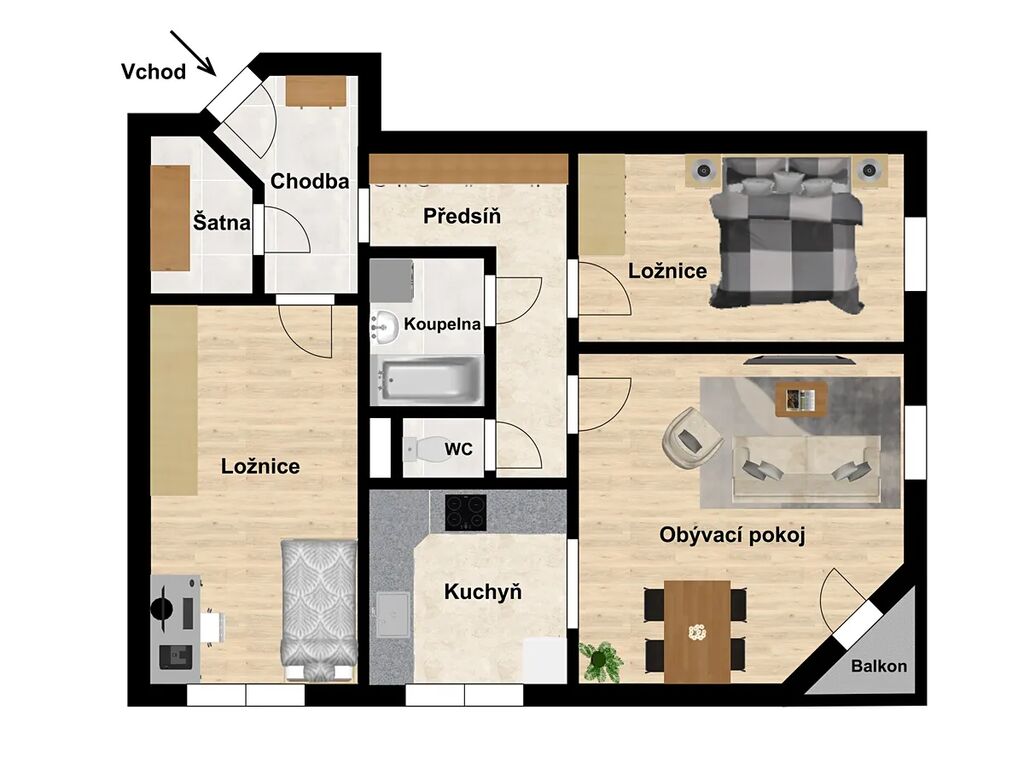 Bytová jednotka má skvělých 75,36m2 užitné plochy + balkón 2m2 a sklep 4,7m2. Dispozičně je složen z prostorného obývacího pokoje, ložnice, dětského pokoje, kuchyně, chodby a technické místnosti. Je velmi dobře dispozičně řešen a nabízí tak možnost bydlení vícečlenné rodiny.