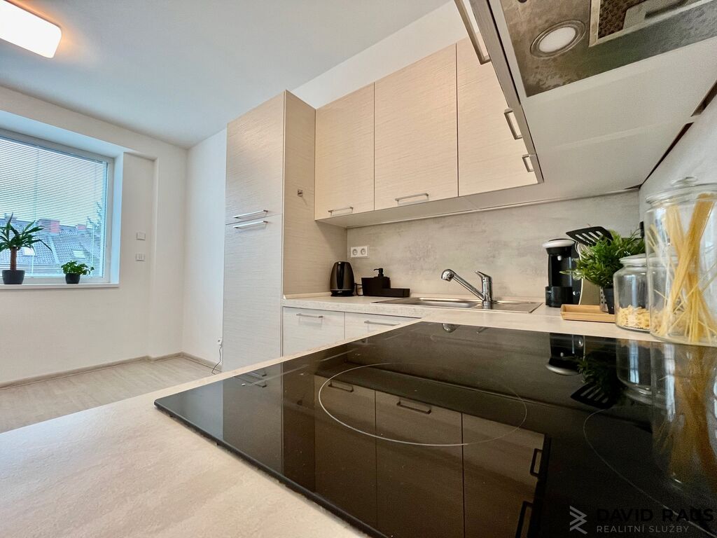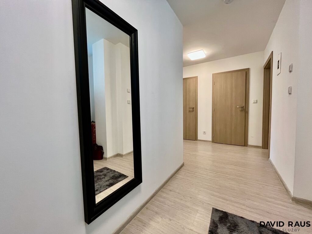 První naše kroky vedou do předsíně (14,6 m²), ze které postupně vstoupíme do všech částí bytu. V pravé části se nachází ložnice (13 m²) v které je umístěná vestavěná skříň s integrovaným zrcadlem. V ložnici jsou instalovány předokenní hlíníkové žaluzie. Naproti ložnice je situována kuchyně s obývacím pokojem (14,7 m²). Kuchyně nabízí dostatek místa na vaření, stolování i odpočinek. Kuchyňská linka je ve skvětlém dekoru, který se nese celým interiérem, prostor dokonale zútulňuje. Součástí linky jsou elektrospotřebiče: elektrická trouba se sklokeramickou deskou, lednice s mrazákem a myčka na nádobí. V kuchyni je také instalována kvalitní rekuperační jednotka, která zajišťuje optimální výměnu a cirkulaci vzduchu. Současně je z místnosti přístup na balkon. V neposlední řadě vcházíme do koupelny (3,7 m²), kde je umístěna praktická sprcha Samozřejmostí je oddělená toaleta ( 1,9 m²). Součástí bytu je sklep.