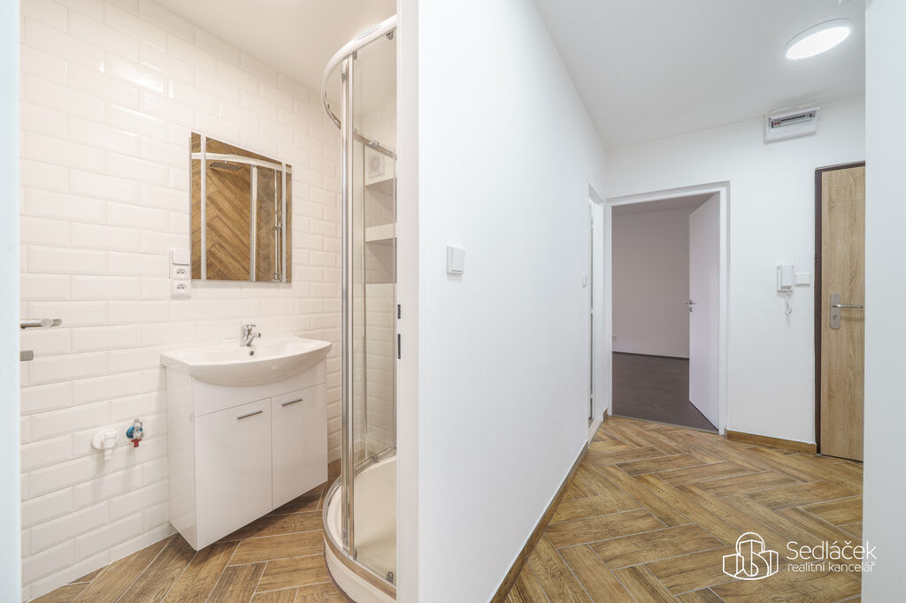 V koupelně se nachází sprchový kout, místo pro pračku, WC je řešeno samostatně. Předsíň nabízí velkou šatnu, kterou lze využít také jako komoru – skvělý bonus pro pohodlné ukládání sezónních věcí i domácích potřeb.