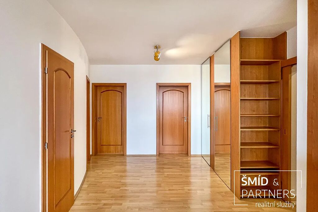 K prodeji nabízíme velmi hezký byt 3+kk o velkorysé ploše téměř 90 m2 a s lodžií o ploše cca 8 m2. Byt se nachází v 5. NP sedmipodlažního bytového domu v ulici Amforová v pražských Stodůlkách. Byt disponuje velkorysým obývacím pokojem s kuchyňským koutem a skutečně velkými a prakticky řešenými úložnými prostory, které jsou přístupné ze vstupní chodby a elegantně skryté za posuvnými dveřmi. Vybaveny jsou na míru zhotovenými vestavěnými skříněmi a policovým systémem. U vstupní chodby se nachází jedna z původních lodžií, která je nyní, po zasklení, přeměněna v malou pracovnu. Za posuvnými dveřmi oddělujícími vstupní chodbu od centrálního prostoru vpravo se nachází dvě ložnice a naproti se nalézá koupelna a samostatná toaleta. Centrální místnost má téměř čtyřicet metrů čtverečních a je krásně prosvětlena okny v celé šíři místnosti. Díky své velikosti je zde dost místa pro prostornou kuchyňskou linkou s ostrůvkem a barem, jídelním koutem a obývací částí vybavenou třídílnou sedací soupravou. V této místnosti je vstup na lodžií. Koupelna a toaleta je situována v and #34;poloeliptickém and #34; vnitřním jádru s dveřmi pootočenými směrem k ložnicím a chodbě s dalšími vestavěnými skříněmi. Toto řešení poskytuje jistou dávku intimity a jsou tak opticky méně exponované obytnému pokoji. Tvar vnitřní poloeliptické příčky je následně propsaný do zakřiveného kuchyňské ostrůvku. Toto designové řešení vnáší do interiéru velmi zajímavé pojetí, které je mimo jiné velmi praktické, a dovolilo tak koupelně a toaletě získat cenné čtvereční decimetry. Dvě souběžné ložnice jsou výhledem do vnitřní zástavby opět prosvětleny velkými okny a jejich velikost plně splňuje svůj účel hlavní ložnice a dětského pokoje. Dalším velmi netradičním prvkem bytu je instalace dvojtónových dřevěných eurooken. Z venkovní části jsou opatřena bílým nátěrem a zevnitř je na rámech zachována kresba dřeva. Díky tomu, spolu s dřevěným nábytkem, kuchyňskou linkou, plovoucí podlahou, barvou dveří a detailů jako jsou dřevěné parapety a obložky, byt rozhodně nepůsobí dojmem starší panelové zástavby. Kuchyňský kout je jedním slovem velký, což ocení zejména ti, kteří tráví v kuchyni hodně času ať už ze záliby, či z potřeby nasytit rodinu. Linka je vybavena plynovou varnou deskou, horkovzdušnou troubou, myčkou nádobí, kombinovanou chladničkou a nezbytnou digestoří. Koupelnu s vanou se sprchovou zástěnou ocení zastánci sprchování i milovníci vany. Místo se zde našlo i pro automatickou pračku. Toaleta je samostatná a v její zadní části se tradičně nachází přístup do stoupaček.