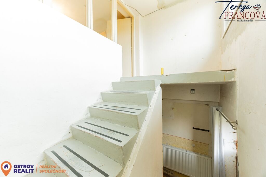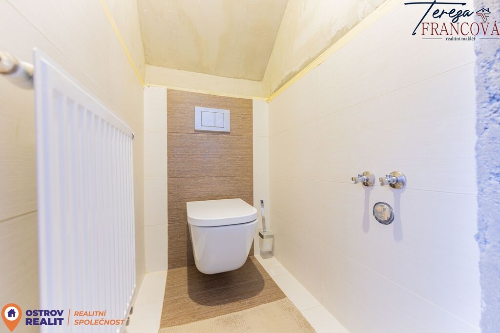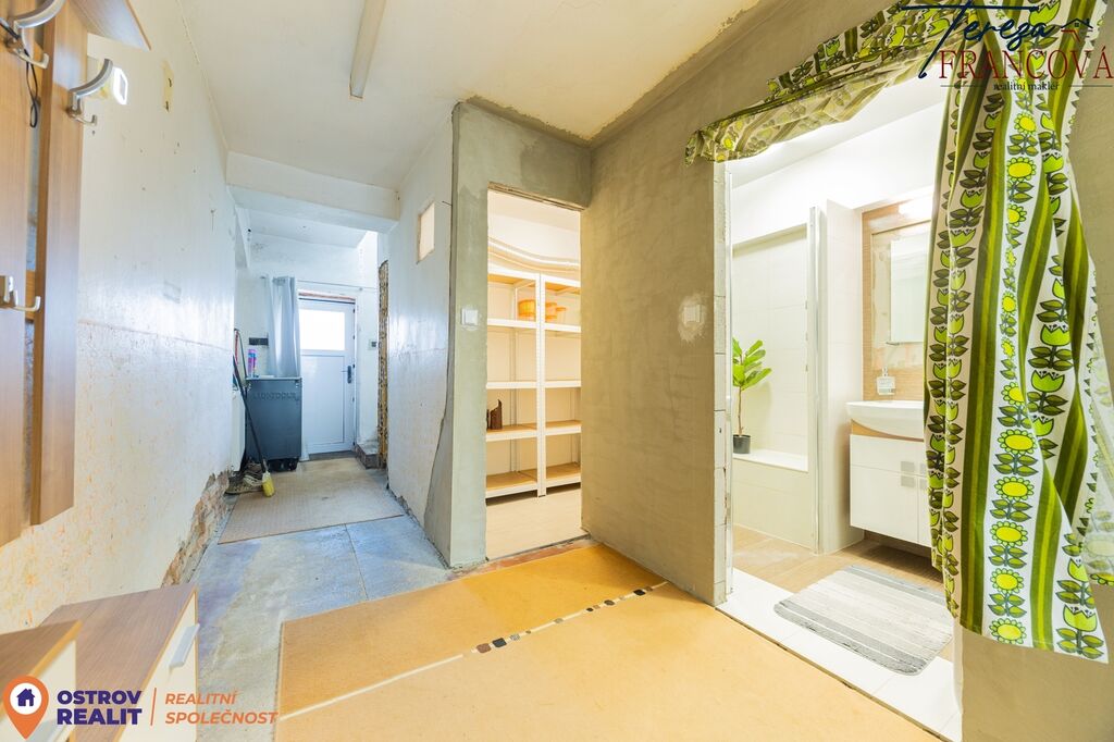 V přízemí se nachází vstupní chodba, nově vybudovaná koupelna se sprchovým koutem, podlahovým topením, žebříkem a místem pro pračku i sušičku. Dále zde najdete samostatné WC, spíž a vstup na rozlehlou zahradu. Celý dům je vytápěn radiátory, zatímco koupelna má komfortní podlahové vytápění.