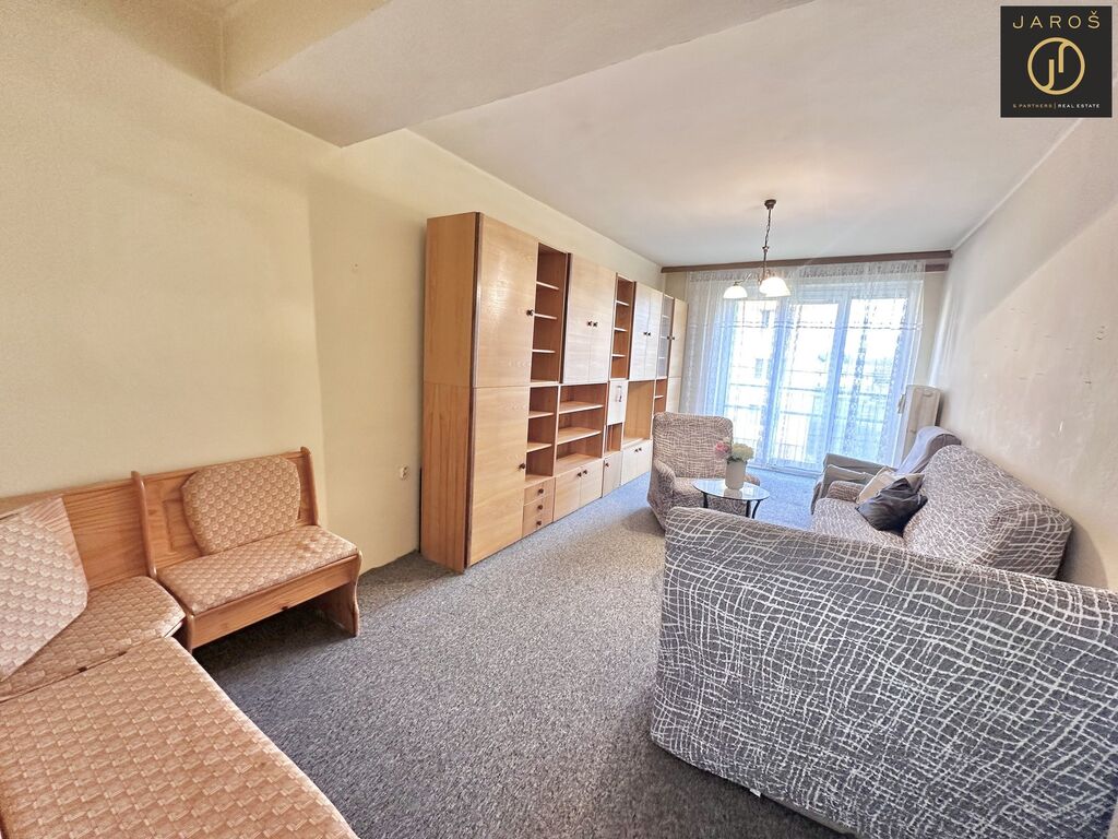 Velký a prostorný obývací pokoj s francouzskými okny přináší do bytu množství denního světla a působí vzdušně. I když není k dispozici klasický balkon, prostor u oken lze efektivně využít například pro sušení prádla nebo pěstování rostlin.