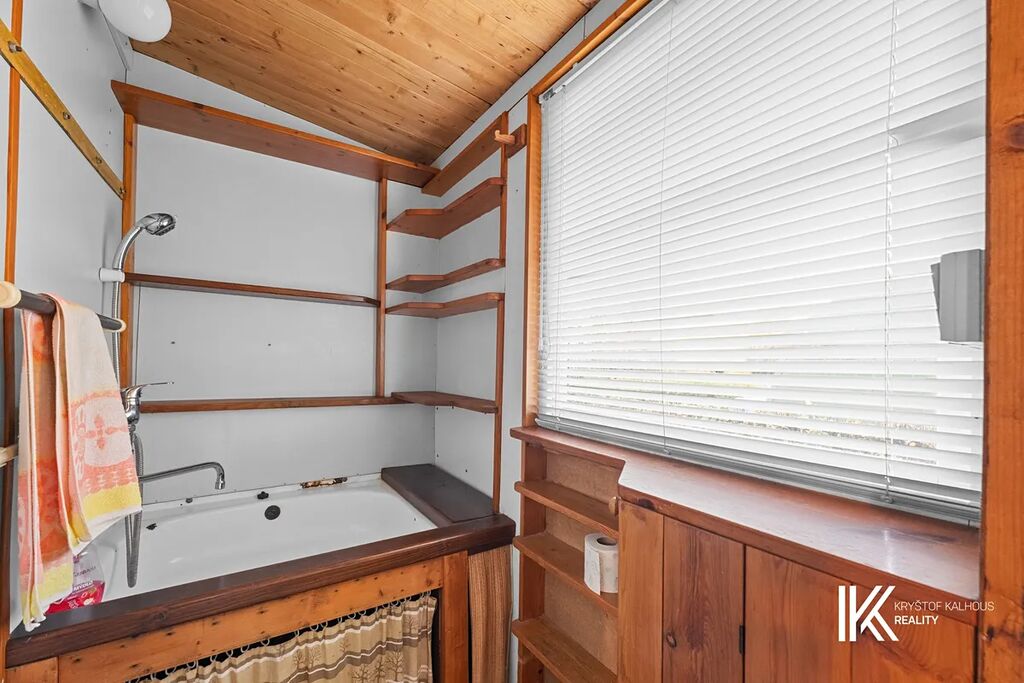 První jednotka o užitné ploše cca 40 m² prošla modernizací a působí svěže a útulně. V přízemí vás přivítá obývací pokoj s kuchyňskou linkou vybavenou dřezem, sporákem na plynovou bombu a lednicí. Po boku kuchyňské linky se otevírá výstup ven na zahradu, do její jihovýchodní části otevírající se směrem k lesu. Dále se v přízemí nachází koupelna s moderním sprchovým koutem, umyvadlem a toaletou. Do patra vede typické chatařské schodiště a najdete tam dva malé pokojíky, které jsou oddělené pouze dispozičně, nikoliv dveřmi. Vytápění v této jednotce zajišťují kamna na tuhá paliva a klimatizace, která v létě prostor ochladí a v zimě přitopí. Naopak zde momentálně není zajištěn ohřev teplé vody, bojler chybí.