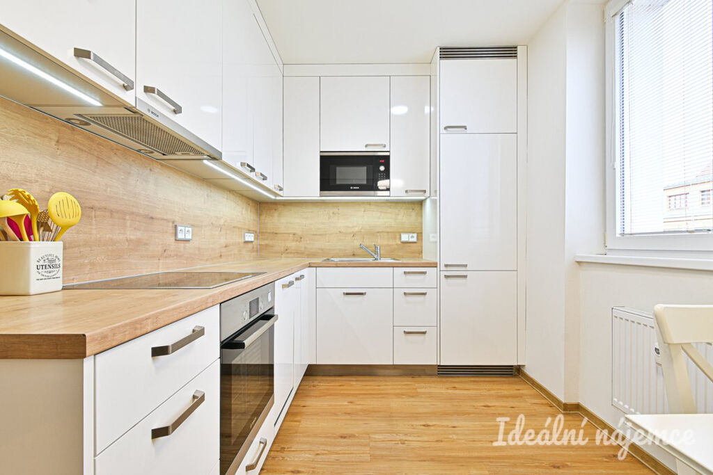 Byt se nabízí částečně vybavený dle fotografií. Kuchyně je vybavená linkou, troubou, myčkou, varnou deskou a lednicí. Obývací pokoj i ložnice jsou prostorné a světlé, s krásnou udržovanou dřevěnou podlahou. V koupelně najdeme sprchový kout, umyvadlo a pračku, toaleta je samostatná. Velká vestavěná skříň je v předsíni.