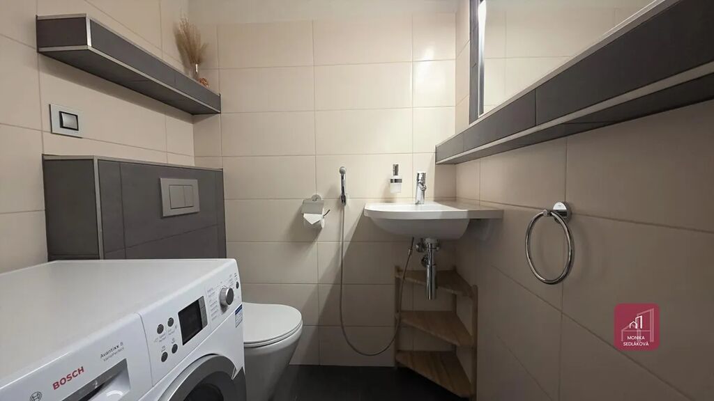 Moderní kuchyně na míru se za budovanými spotřebiči zn. Bosch (horkovzdušná trouba, mikrovlnná trouba, indukční varná deska, myčka a odsavač par) + nerezová lednice s mrazákem. Designová světla v celém bytě.