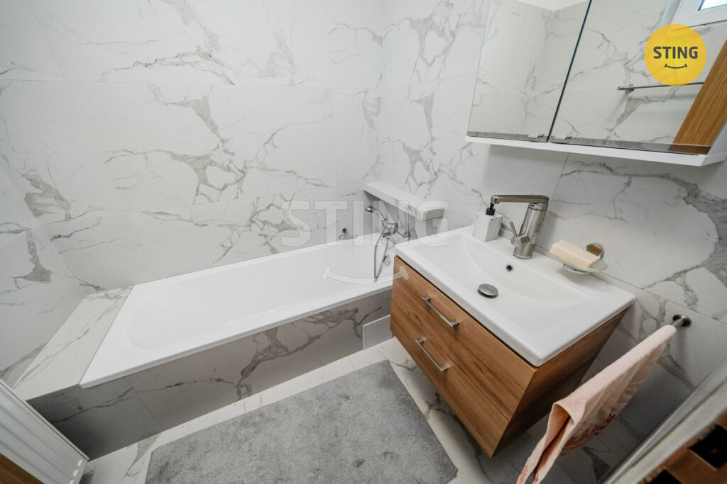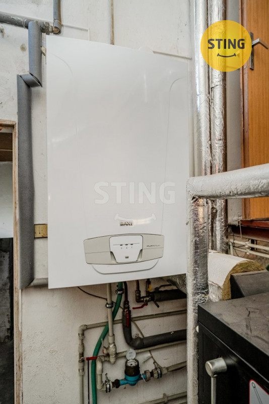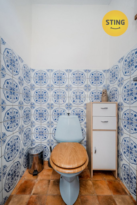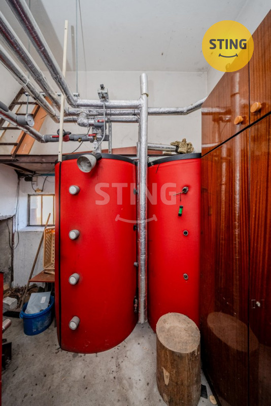 V prvním patře najdete tři ložnice, z nichž jedna má vlastní balkon, dále velký obývací pokoj s jídelnou, kuchyni se spíží, koupelnu a samostatné WC. Dispozice tak nabízí dostatek prostoru i pro početnější rodinu. O vytápění se stará plynový kondenzační kotel, automat na tuhá paliva a akumulační nádoby – dům tak nabízí komfort i úsporný provoz.