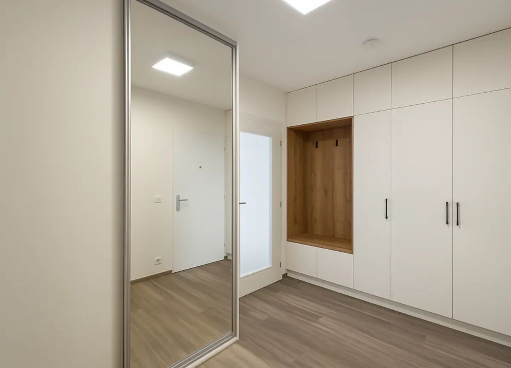 Interiér je laděn do světlých tónů a působí velmi vzdušně. Byt je vybaven kvalitní kuchyňskou linkou se spotřebiči (lednice, mrazák, trouba, indukční varná deska, myčka, digestoř), vinylovými podlahami a venkovními roletami, které zajišťují maximální komfort i soukromí.