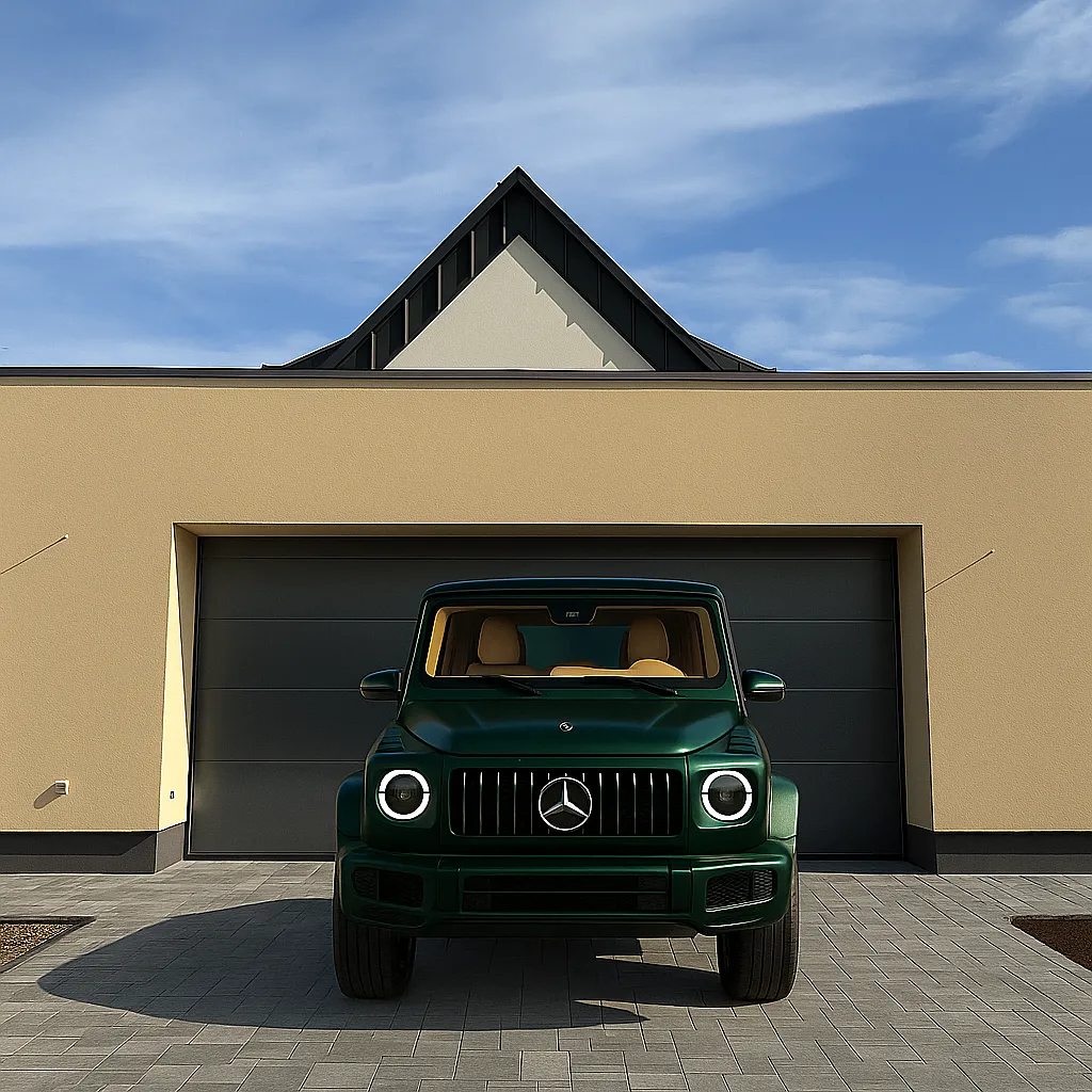 Dům má dvě nadzemní podlaží a prostornou garáž pro dva automobily, s možností dalšího parkování na pozemku.