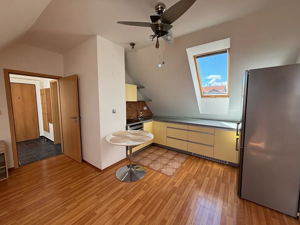 Bytová jednotka je v osobním vlastnictví - je možno využití hypotečního úvěru, se kterým Vám rádi pomůžeme. Bytová jednotka disponuje obýv.pokojem s kuch.koutem orientovaným na východ a západ o výměře 19,55m2, pokojem orientovaným na východ a západ o výměře 13,68m2, chodbou o výměře 5,37m2, koupelnou s rohovou vanou a WC o výměře 6,45m2. Kuchyňská linka s vestavěnými spotřebiči zn. Siemens – el. trouba, sklokeramická varná deska, odsavač par, lednice s mrazákem. V pokoji zůstane vestavěná šatní skříň, pracovní kout, v chodbě komoda na míru, věšák. Střešní okna jsou dřevěná s interiérovými posuvnými roletami. Podlahové krytiny – obýv. pokoj s kuch.linkou a pokoj - plovoucí podlaha, chodba, koupelna s WC – dlažba. Nízké měsíční poplatky – 3.000,- Kč + el.energie bytové jednotky, cca 1.500,- Kč. Bezproblémové parkování – u domu jsou dvě prostorná parkoviště. Bytová jednotka je k dispozici ihned po uhrazení kupní ceny.