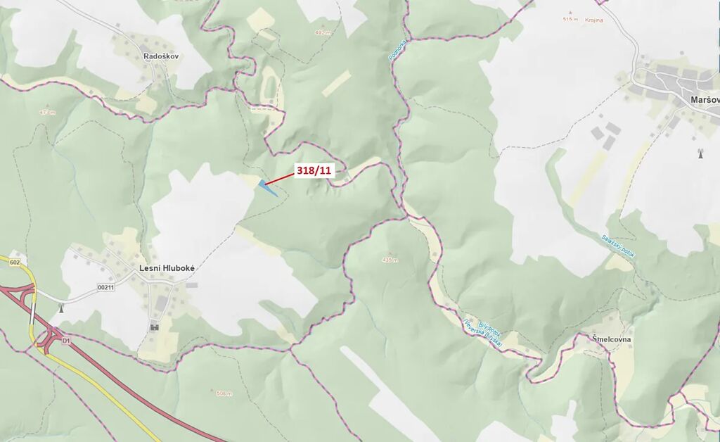Lesní pozemek o výměře 3838 m2, parcelní číslo 318/11, podíl 1/1, katastrální území Lesní Hluboké, obec Lesní Hluboké, obec s rozšířenou působností Rosice, okres Brno-venkov, Jihomoravský kraj. Po těžbě.