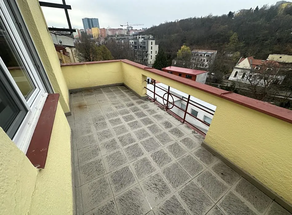 Pronájem bytové jednotky 1-kk s velkou terasou v 5.podlaží činžovního domu bez výtahu. Byt se skládá z kuch. koutu s lednicí a vařičem, obývacího pokoje s velkou vestavěnou skříní a terasou, koupelnou s pračkou. Jde o velice příjemné bydlení s možností relaxace na velké terase. Dobrá dostupností do centra.
