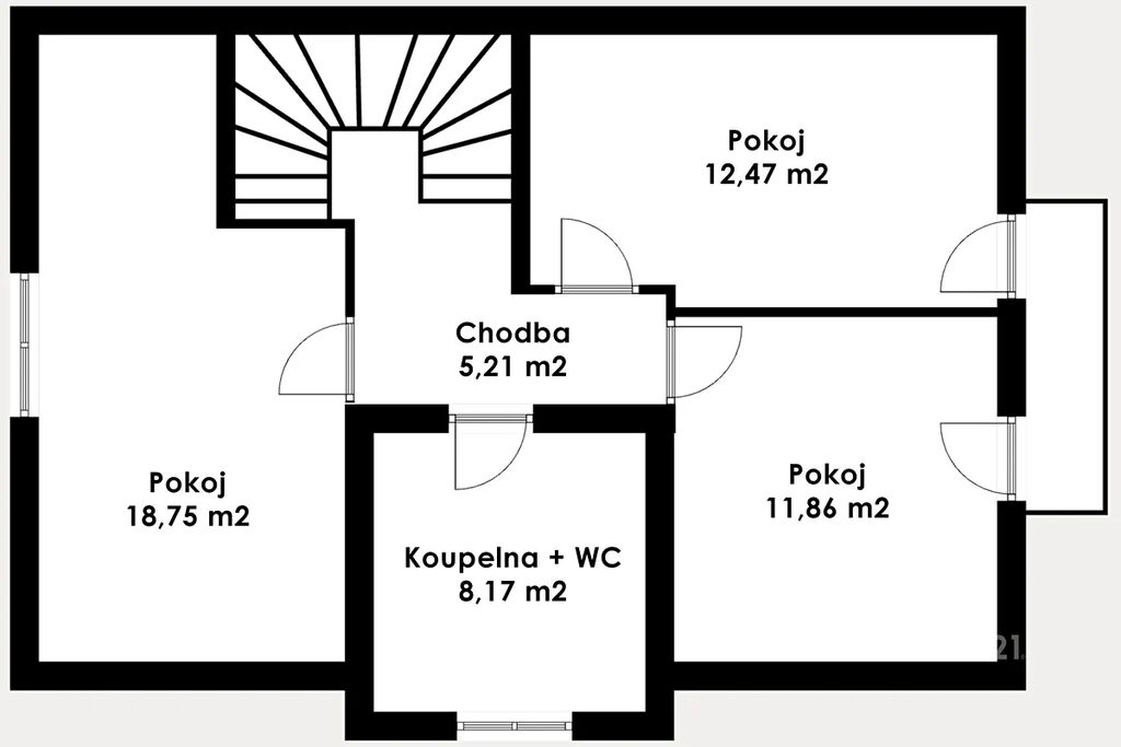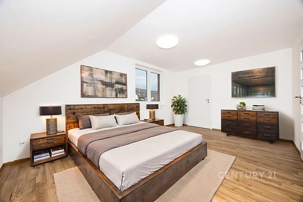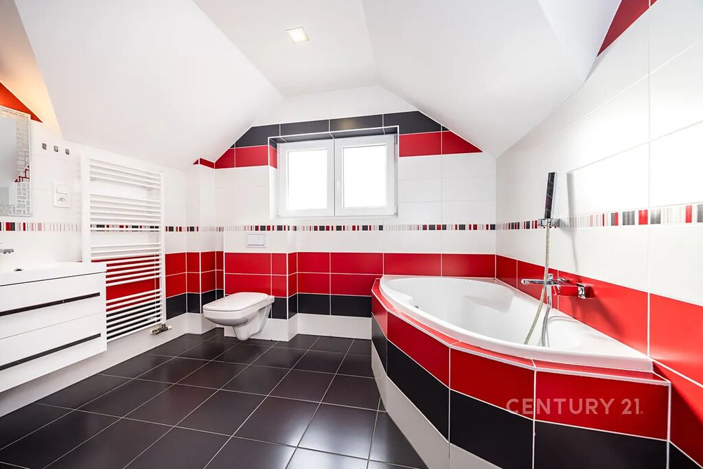 Patro: tři pokoje, z toho jeden se šatnou a dva se vstupem na balkon, velká koupelna s vanou, sprchovým koutem a WC