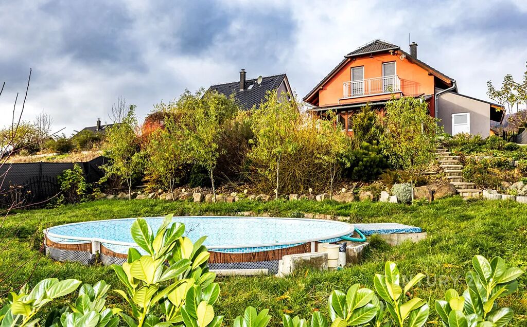 Pozemek disponuje 721 m² udržované zahrady, bazénem, zastřešenou terasou a poskytuje dostatečné soukromí a prostor.