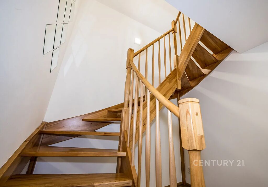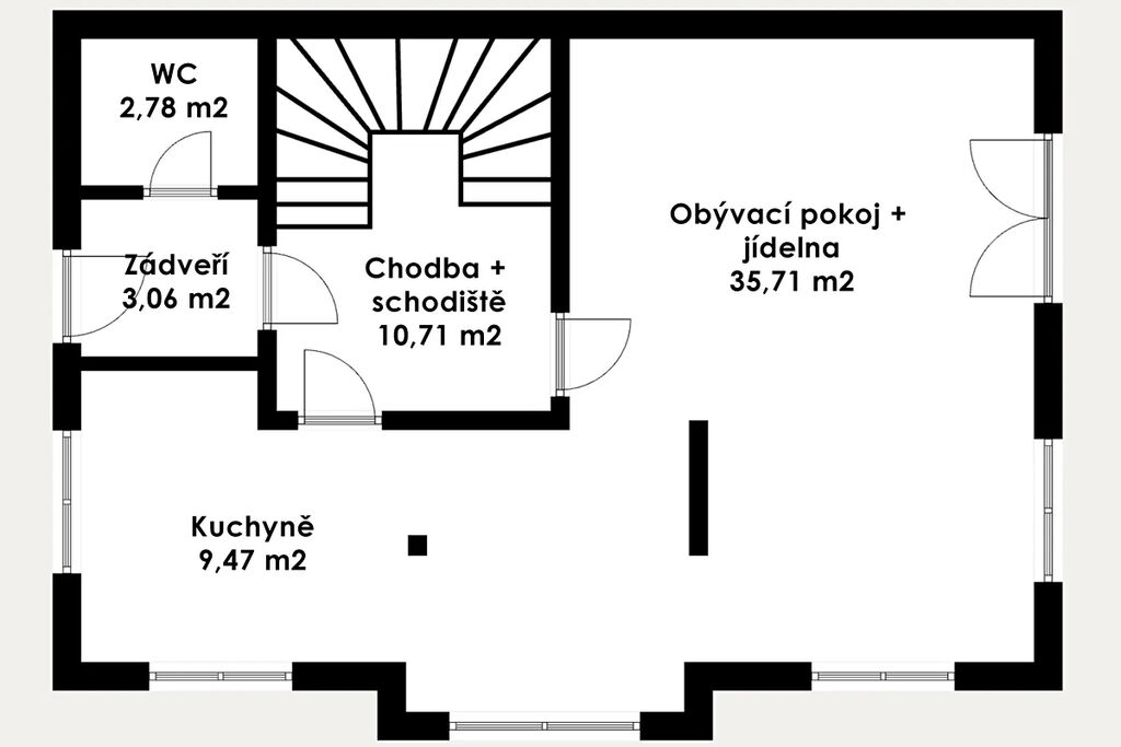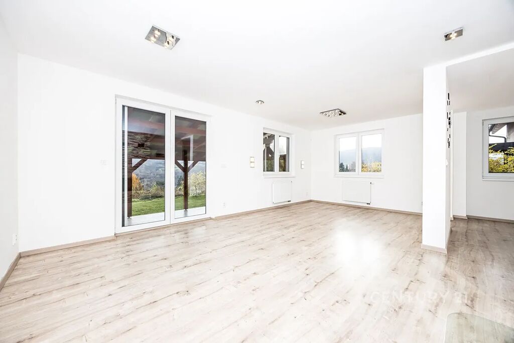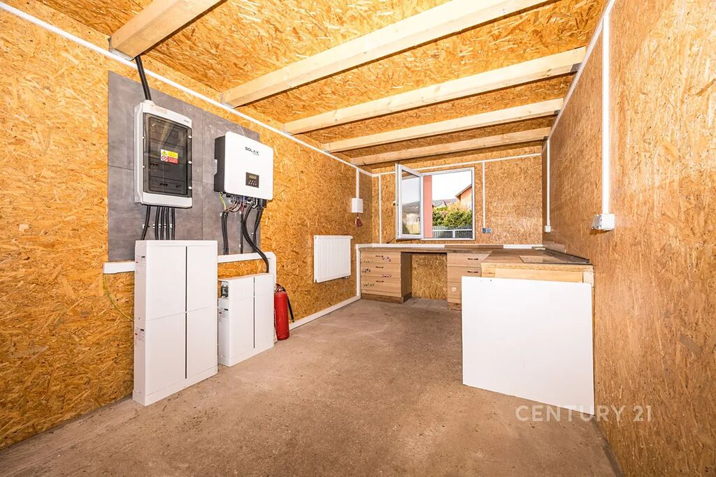 Přízemí: obývací pokoj s vstupem na terasu, kuchyně s jídelnou, technická místnost, dílna, samostatná toaleta, chodba s dřevěným schodištěm