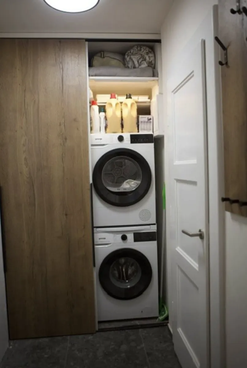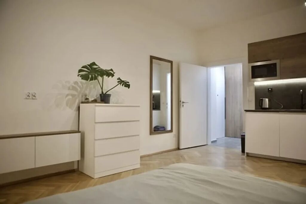 Vybavení bytu zahrnuje základní nábytek přesně tak jak vidíte na fotkách. Také je vybaven spotřebiči jako klimatizace, pračka, sušička, lednice, myčka nádobí, trouba, indukční sporák, mikrovlnná trouba, žehlička, fén. Díky svému praktickému uspořádání a modernímu designu je tento byt ideální pro náročné jedince hledající komfort a klidné bydlení v centru Prahy.