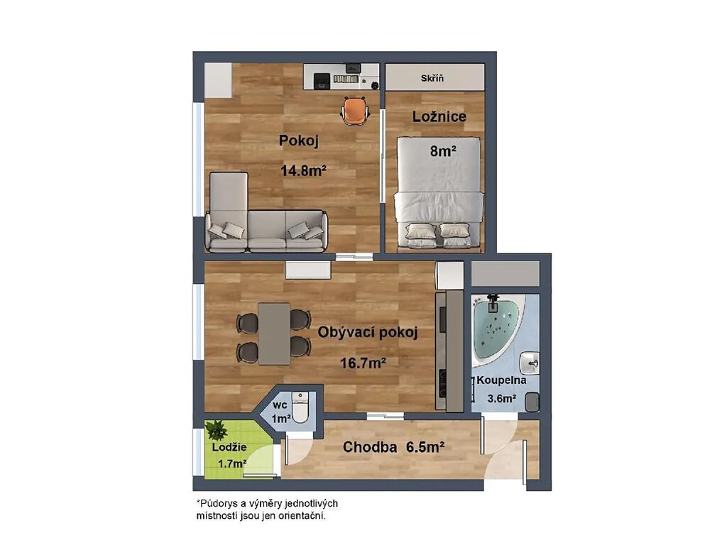 Byt je v dobrém stavu a připravený k okamžitému nastěhování. Příjemnou koupelnu doplňuje samostatné WC a prosklený balkon, který interiéru dodává světlo a příjemné propojení s venkovním prostorem. Praktická vestavná skříň nabízí dostatek úložného místa.