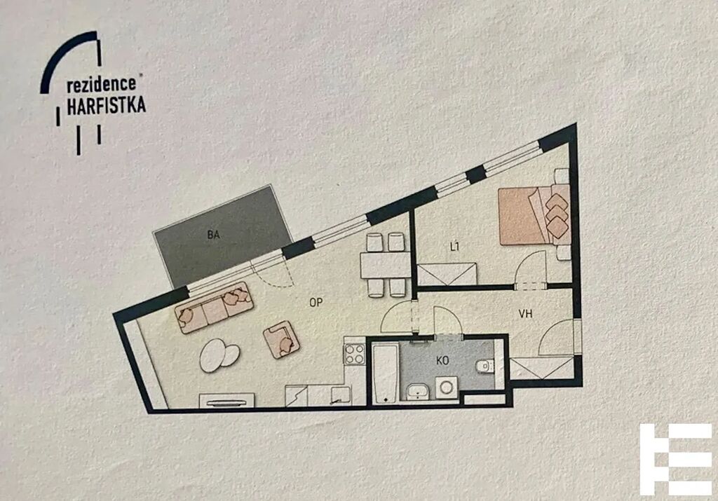 Byt se nachází ve 4NP a skládá se z vstupní haly (7,7 m²), obývacího pokoje (30,3 m²) , ložnice (12,5 m²), koupelny s wc (7,7 m²) a balkonu (6 m²).