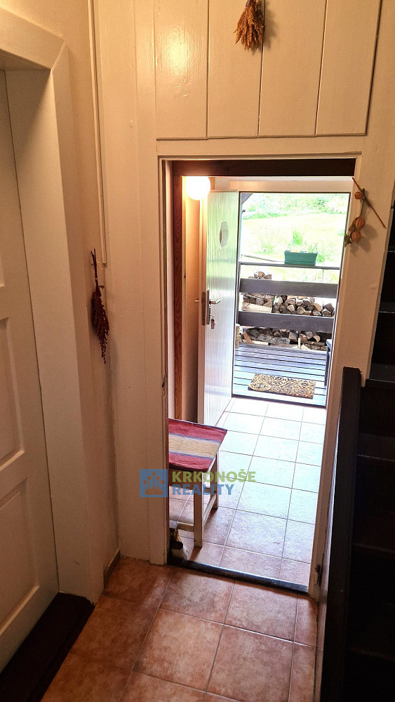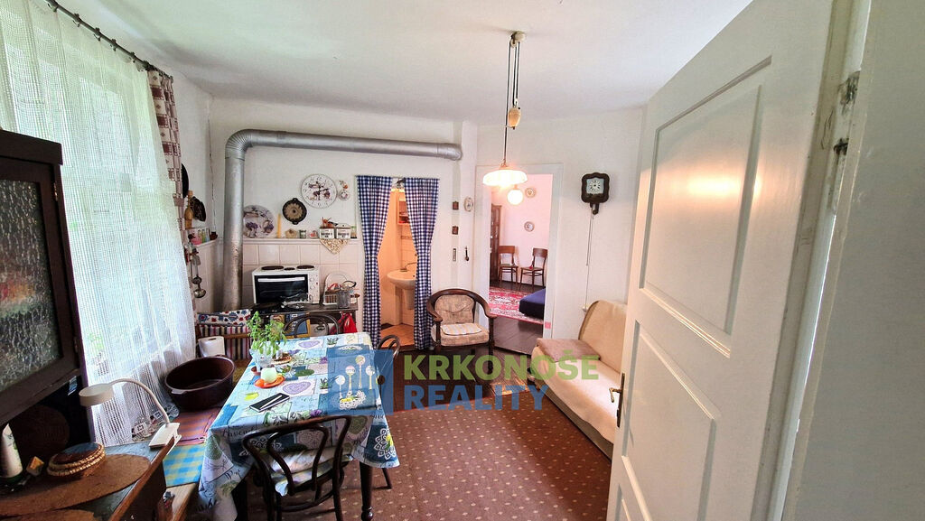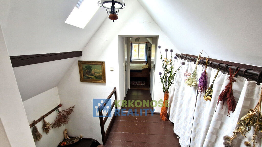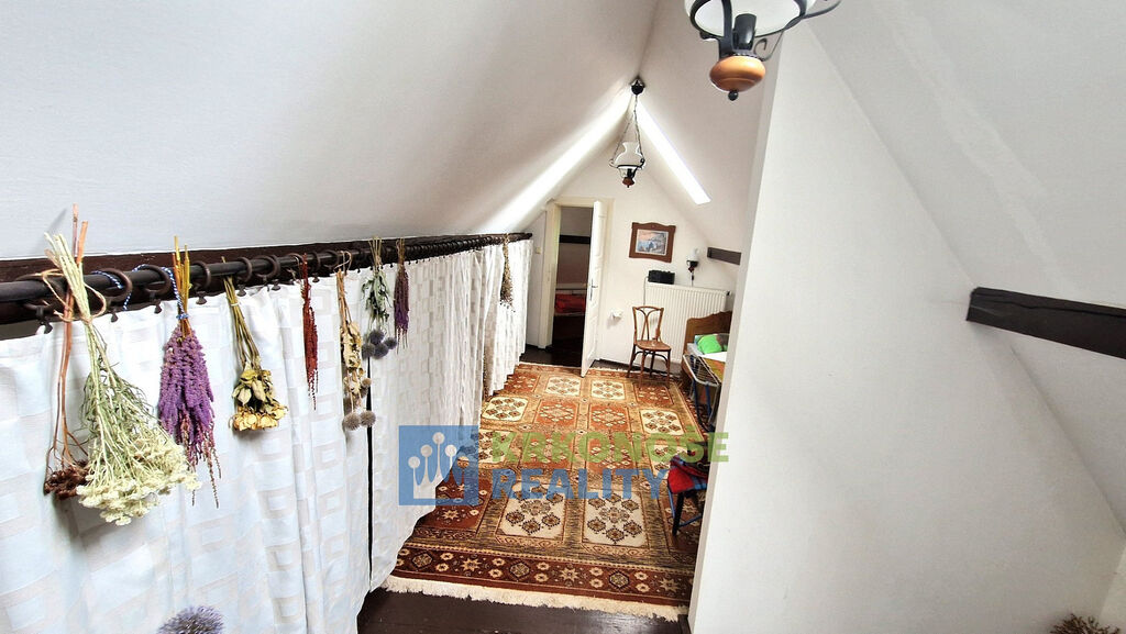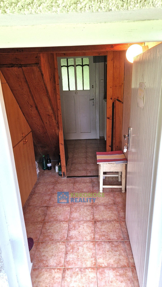 Zděný dům z roku 1936 působí poctivě a mile – má své příběhy a čeká na další. Uvnitř se nachází přízemí s verandou, kuchyní s jídelním koutem, útulným pokojem, koupelnou s vanou i praktickou kotelnou. Po dřevěném schodišti se vystoupá do podkroví, kde jsou dvě ložnice, předpokoj a malé WC – prostor, kam ranní světlo vstupuje skrze okna s výhledem do korun stromů.