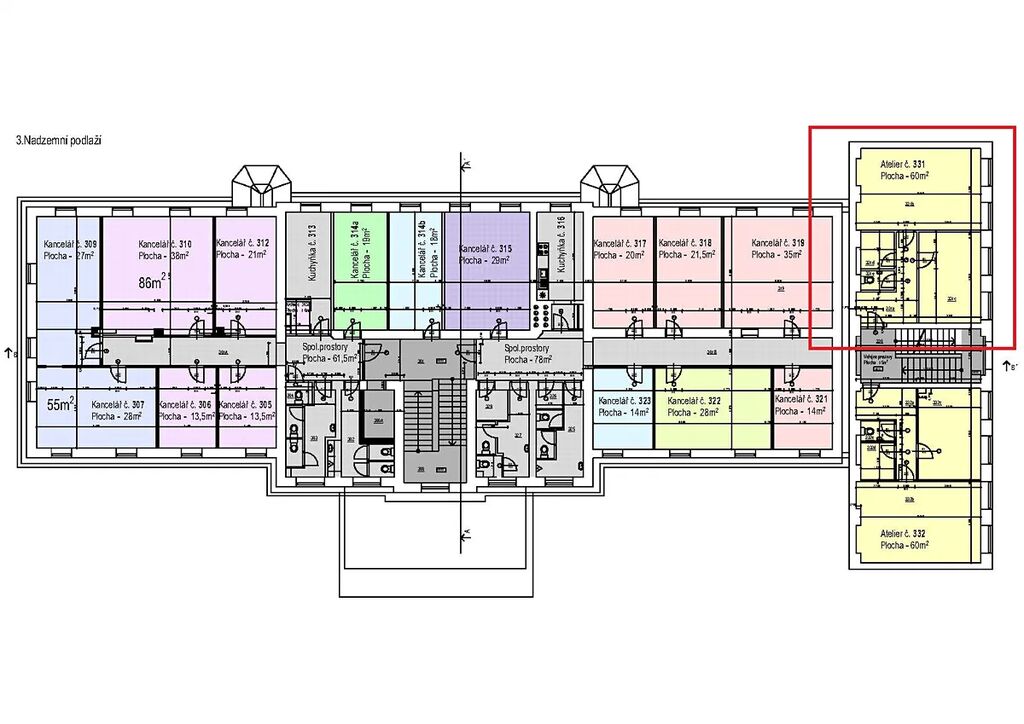 Nabízíme k pronájmu prostorný ateliér s celkovou plochou 60 m2. Ateliér se nachází v 3. nadzemním podlaží, přístupný z vchodu B. Je vhodný pro kancelářskou činnost.