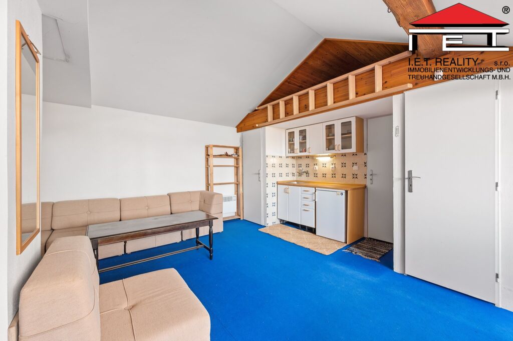 Po schodech se dostaneme do obytného 1.NP, kde se nachází rozkládací sedací souprava, dvoulůžková postel, kuchyňský kout, WC, koupelna. Z obytné části je vstup na vrchní část pozemku s posezením a krásnými výhledy do okolí.