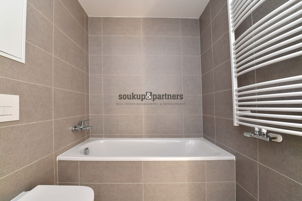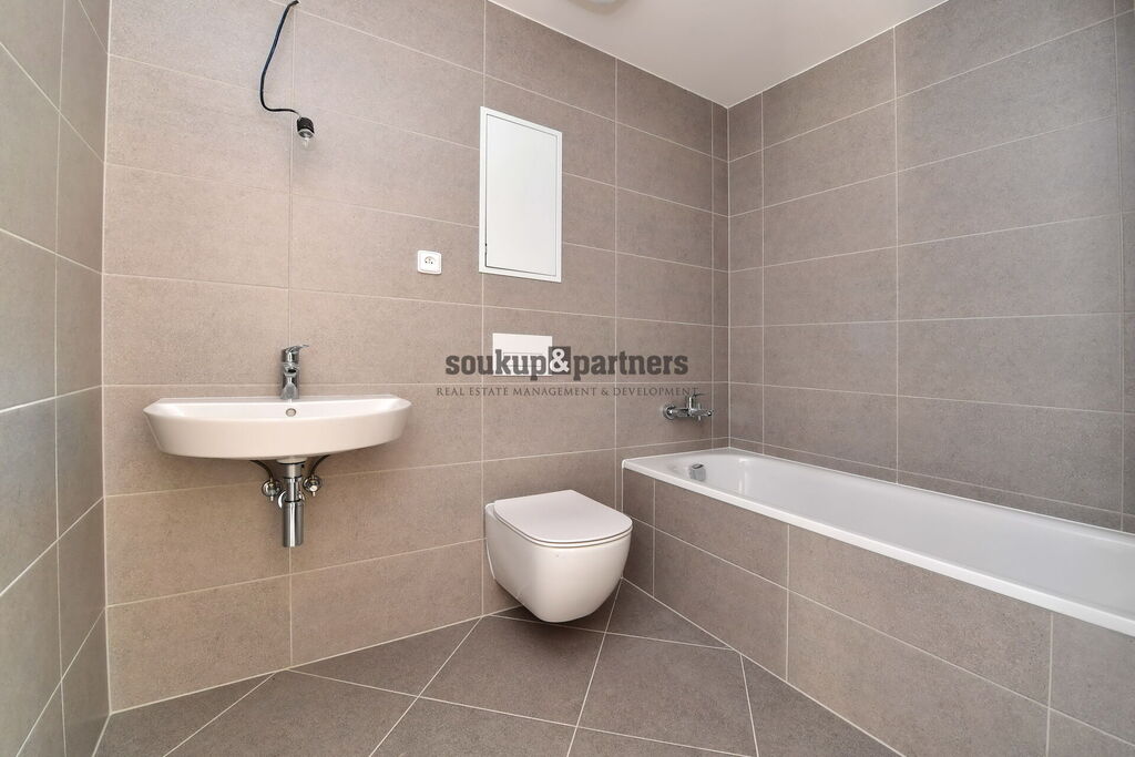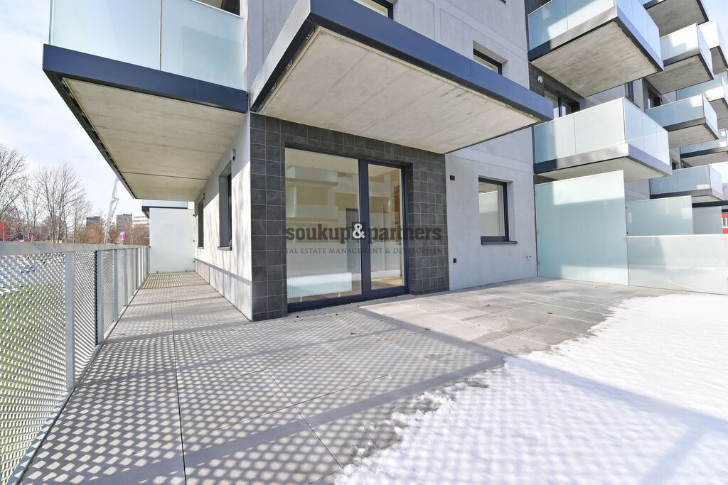 Pronájem bytu 2+kk o výměře 52,8 m² + terasa (49,8 m²) + sklep (4,8 m2) + garážové stání, který se nachází v 1. nadzemním podlaží novostavby v projektu Nad Krocínkou, Praha 9 - Prosek.