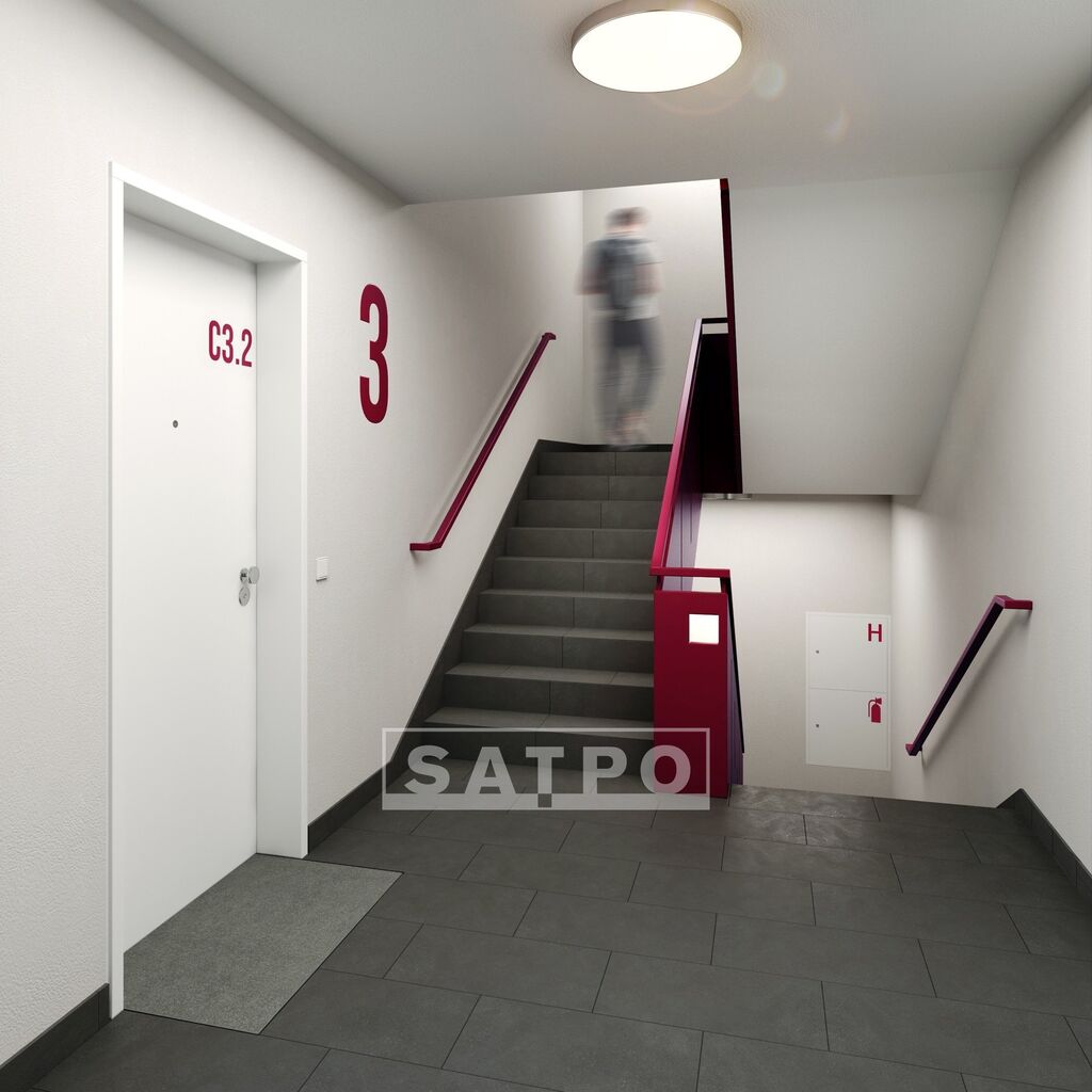 Dispozici tvoří prostorná vstupní hala, která plynule přechází do obývacího pokoje s přípravou na kuchyňský kout o rozloze 24,3 m². Odtud je přímý vstup na východně orientovanou lodžii, ideální pro ranní kávu či relax na slunci. V hale se nachází samostatná toaleta přístupná přes praktickou předsíňku.