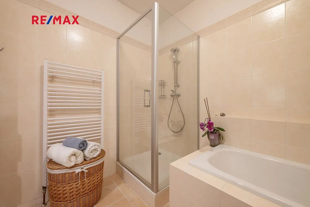 Koupelna (7,6 m²) nabízí jak vanu pro odpočinek, tak samostatný sprchový kout.