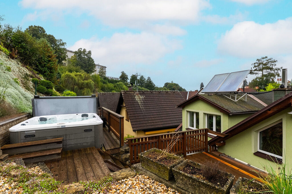 Součástí domu jsou dvě prostorné garáže o celkové ploše 44 m², které poskytují komfortní parkování i dostatek úložného prostoru. K odpočinku a relaxaci poslouží terasa cca 20 m² vybavená vířivkou s průtokovým solárním kolektorem.