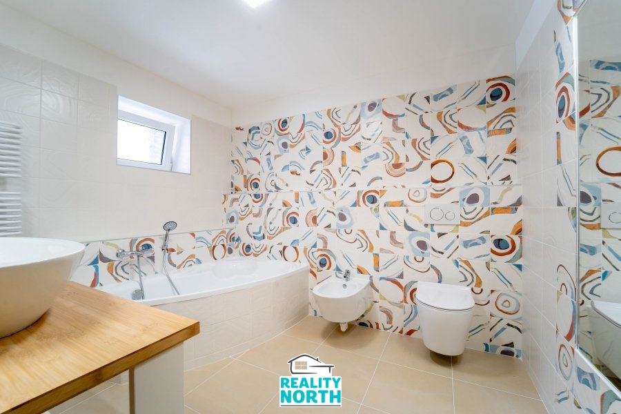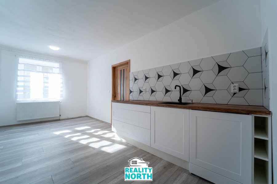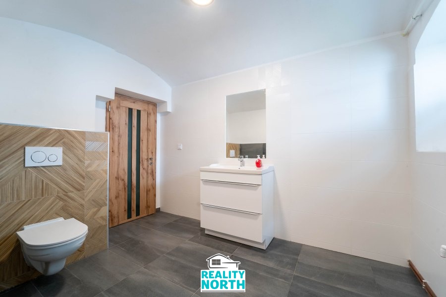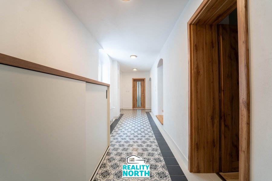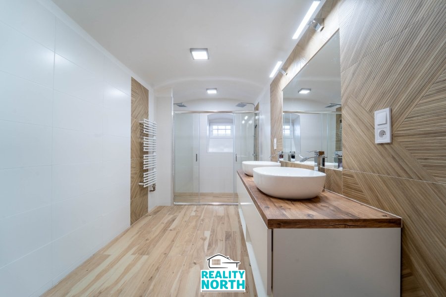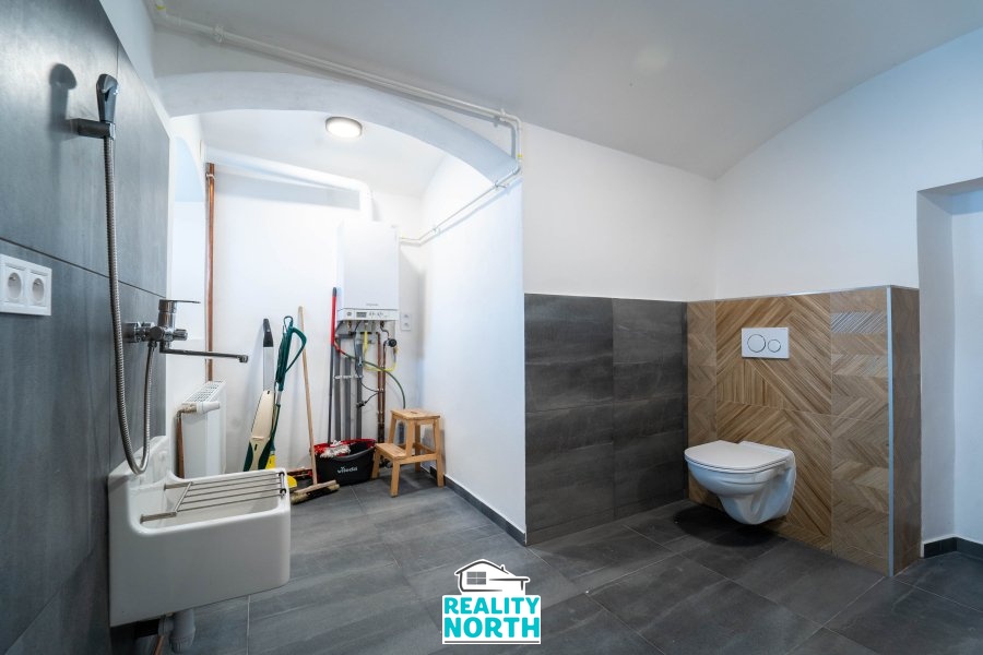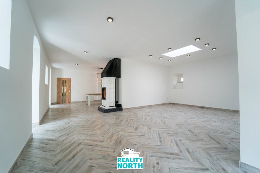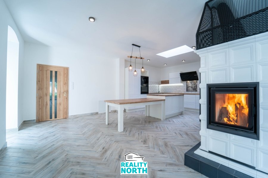 V levé části přízemí se pak nachází velká koupelna s toaletou, dvěma umyvadly a sprchovým koutem. Velkorysý prostor kuchyně s novými vestavěnými spotřebiči a plynule navazující obývací pokoj s kachlovými kamny. Tento prostor je zároveň vytápěn podlahovým topením. Z tohoto prostoru lze vstoupit na terasu a následně na zahradu.