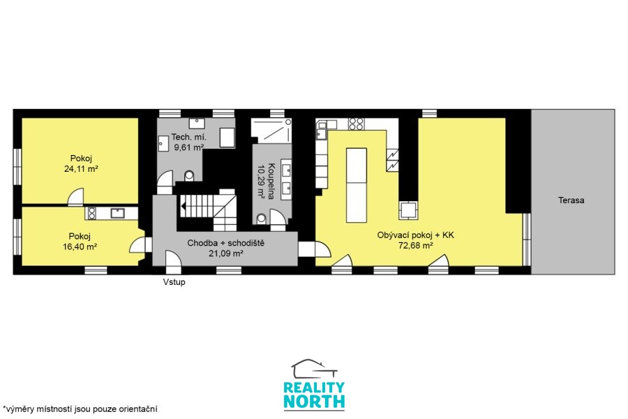 Po vstupu do domu, v prostorné chodbě se po pravé straně nachází prostor, který je koncipován jako apartmá s kuchyňkou pro hosty. Lze využít také jako bydlení pro seniora, nebo kancelář, s možností užívat toaletu v sousedící technické místnosti, hned naproti vstupu do domu.