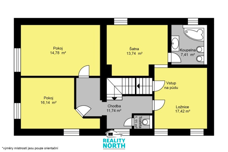 Do prvního patra vystoupáme po jasanem nově osazených schodech, do prostoru malé chodby se samostatnou toaletou určenou pro dva pokoje v pravé časti, využitelné jako dětské pokoje.