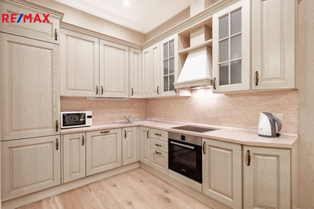 Elegantní obývací pokoj propojený s kuchyní, která je vybavena vestavěnými spotřebiči značky BOSCH (elektrický sporák, trouba, lednice s mrazákem, myčka nádobí).