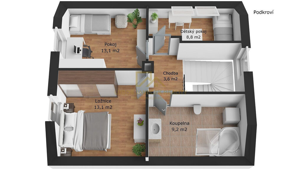 2. nadzemní podlaží: Vstup je po schodišti do chodby (3,6m²) a dále do samostatných pokojů - ložnice (13,1m²) se šatnou, pokoje (13,1m²) a dětského pokoje (8,8m²). Z chodby je vstup do koupelny (9 m²).