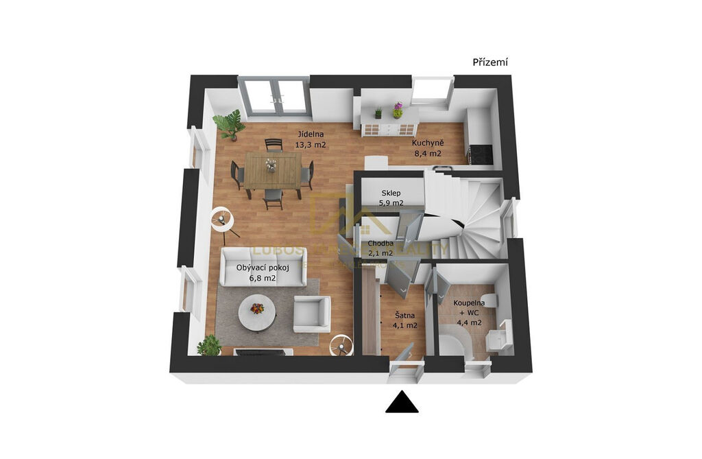 1. nadzemní podlaží: Po vstupu do domu vejdete do chodby a šatny (6,2m²), dále do obývacího pokoje (28,5m²) s novým a nepoužívaným, kompletně zařízeným kuchyňským koutem a krbovými kamny s výměníkem a vstupem na terasu a zahradu, koupelny se sprchovým koutem a toaletou (9,2m²). Z chodby také vstoupíte dveřmi na schodiště do malého sklepa a nebo vyjdete po schodech do 1. patra.