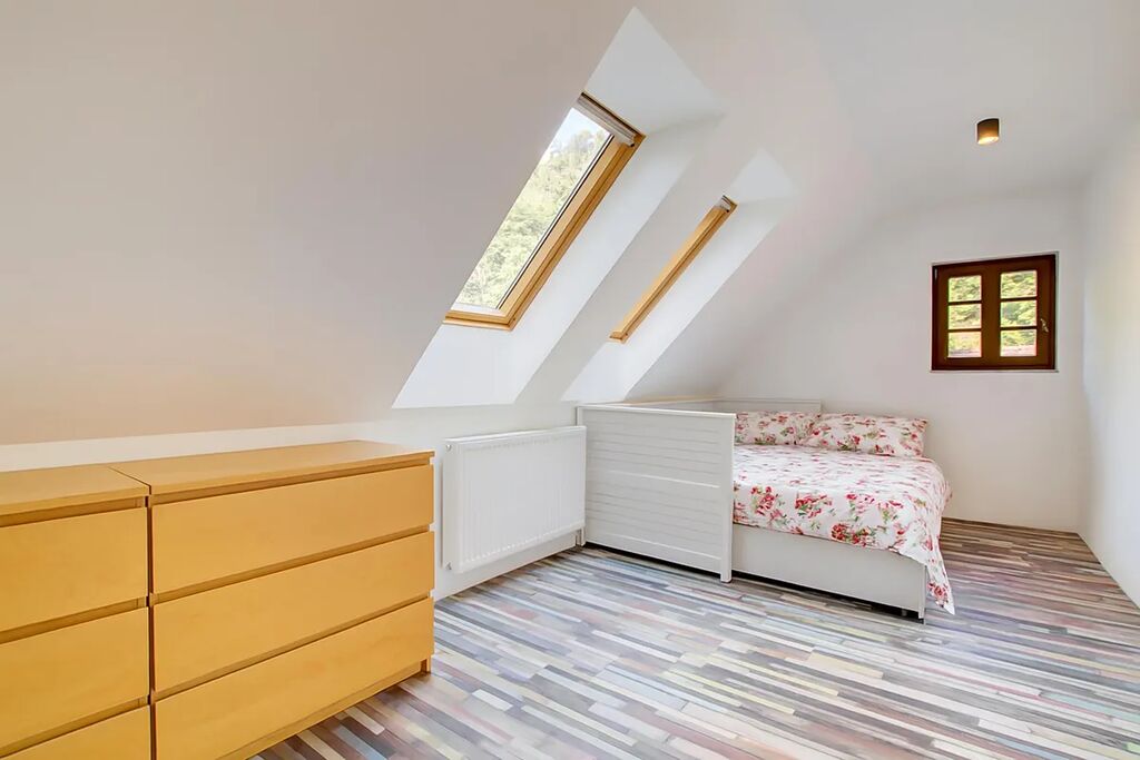 K dispozici jsou celkem 3 ložnice, půda, světlý obývací prostor s kuchyňským koutem, moderní koupelna s WC, velký prostor v přízemí s přípravou pro kuchyň, 3x WC, technické zázemí a dostatek úložných prostor. Interiér doplňují dřevěné trámy, stylové dveře a dostatek přirozeného světla díky střešním i klasickým oknům.