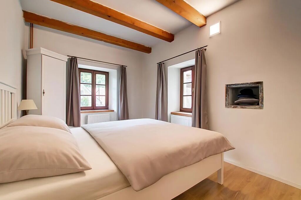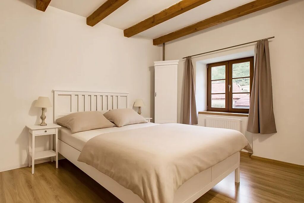 K dispozici jsou v současnosti celkem 3 ložnice, půda, světlý obývací prostor s kuchyňským koutem, moderní koupelna s WC, velký prostor v přízemí s přípravou pro kuchyň, 3x WC, technické zázemí a dostatek úložných prostor. Interiér doplňují dřevěné trámy, stylové dveře a dostatek přirozeného světla díky střešním i klasickým oknům.