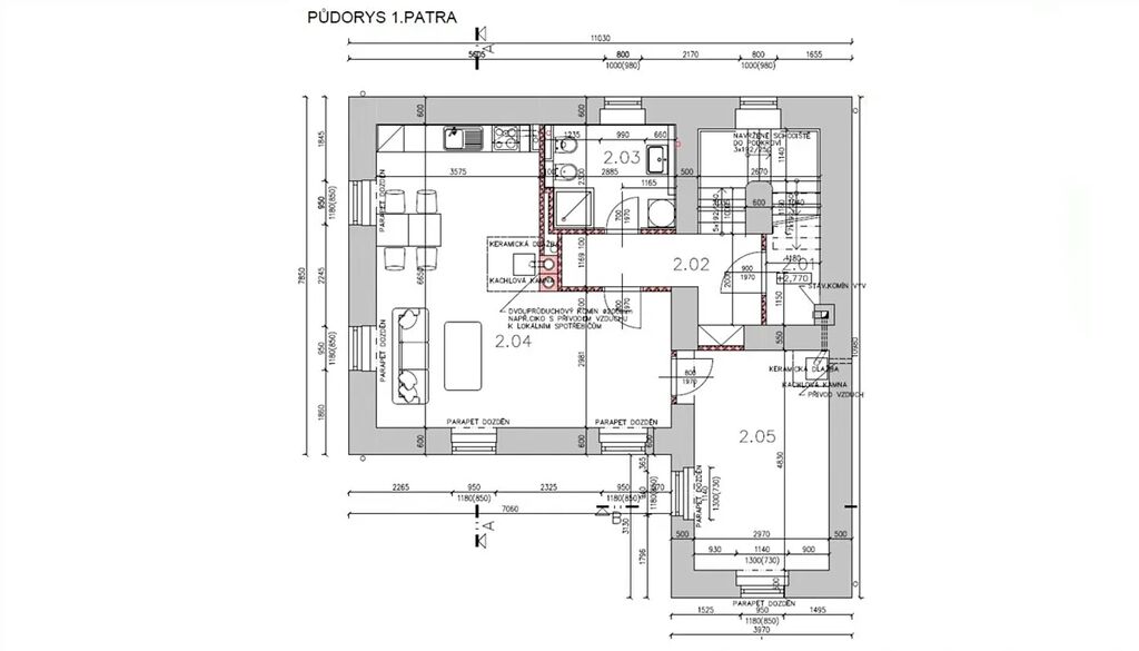 1. patro: světlý obytný prostor s kuchyňským koutem a možností společenské místnosti, ložnice/pokoje pro hosty, koupelna s WC.