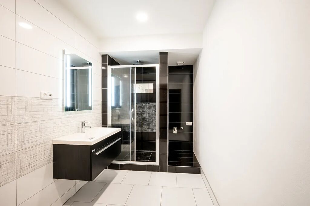 - koupelna se sprchovým koutem, umyvadlem, umyvadlovou skříňkou, zrcadlem a topným žebříkem (7,0 m²)