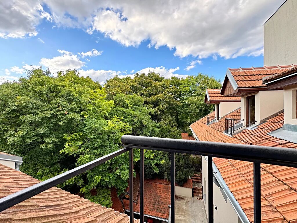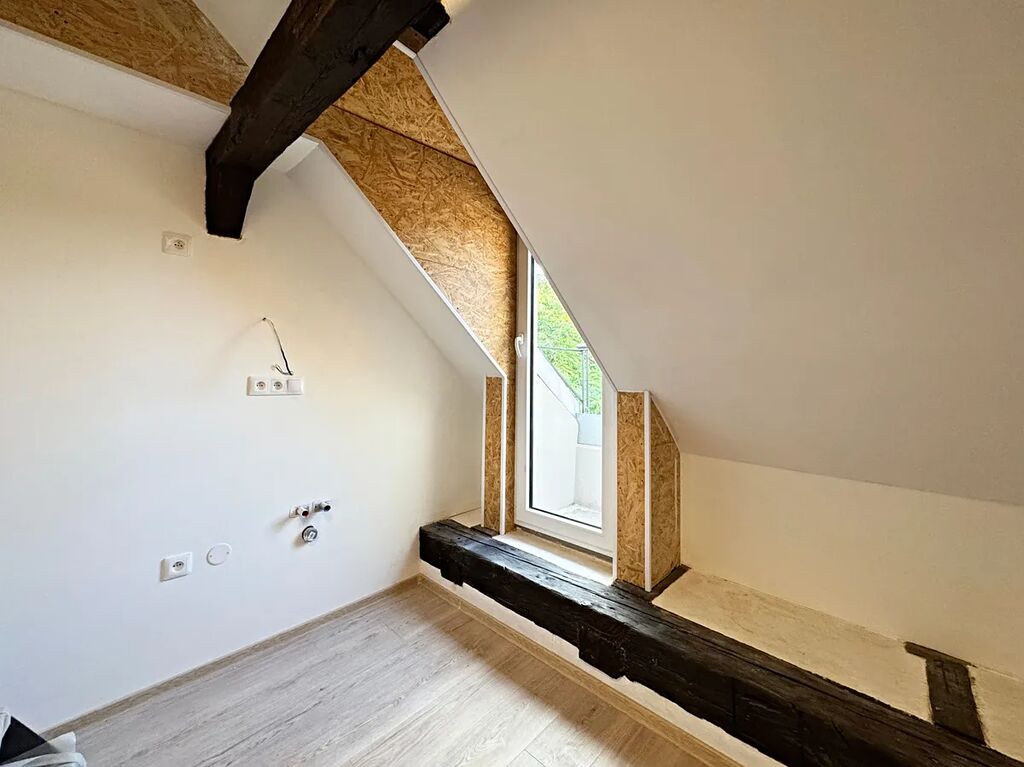 Jedinečnou atmosféru atelieru dotváří přiznané dřevěné prvky a malý balkon, kde s ranní kávou načerpáte energii na celý den.