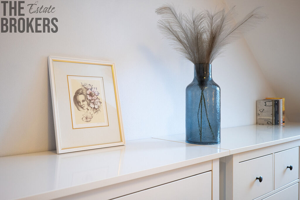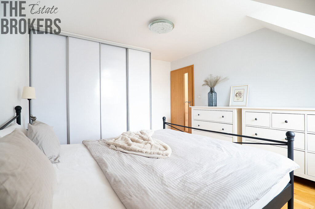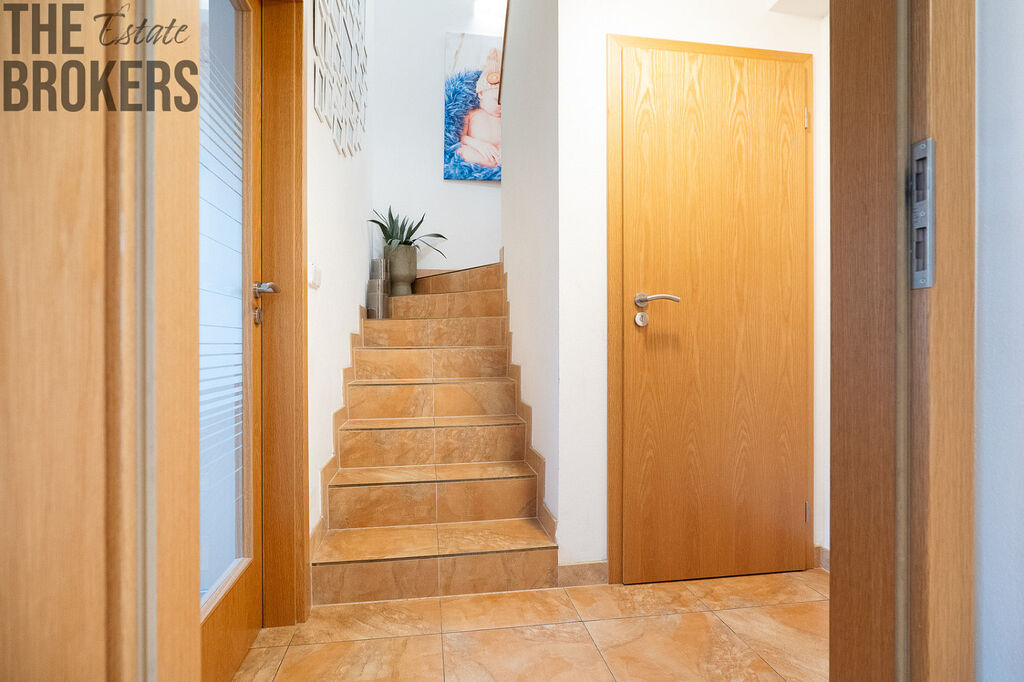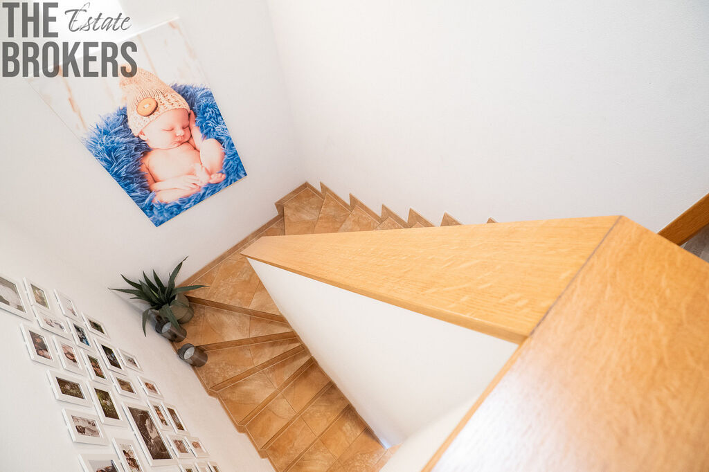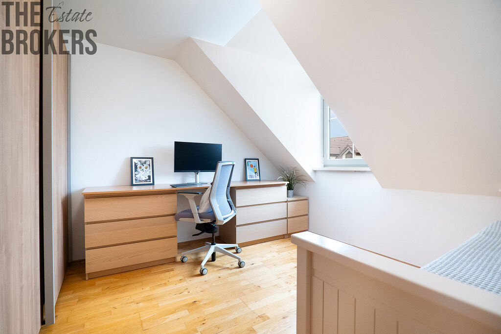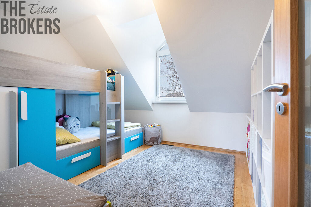V horním patře se nachází tři samostatné pokoje, ideální jako ložnice, dětské pokoje nebo pracovna.