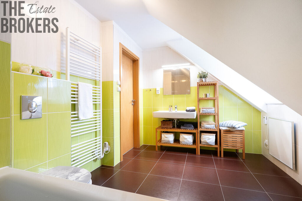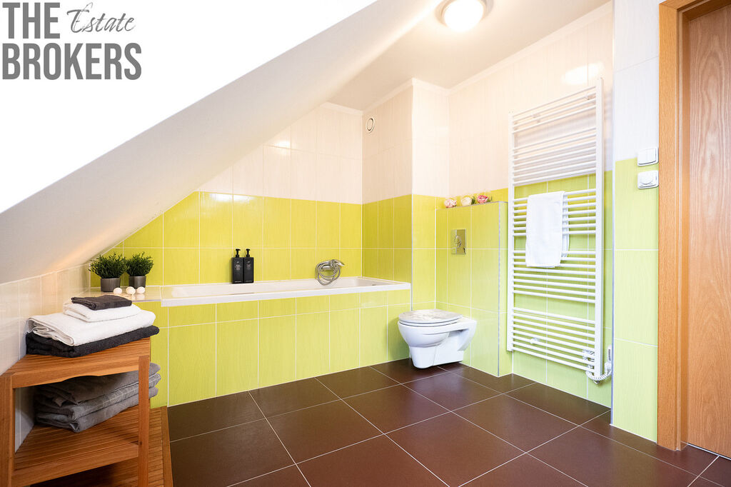 Dále je zde prostorná koupelna s vanou a toaletou. Středová chodba, ze které jsou přístupné všechny místnosti. Schodiště je umístěno uprostřed dispozice a zajišťuje praktické propojení obou podlaží.
