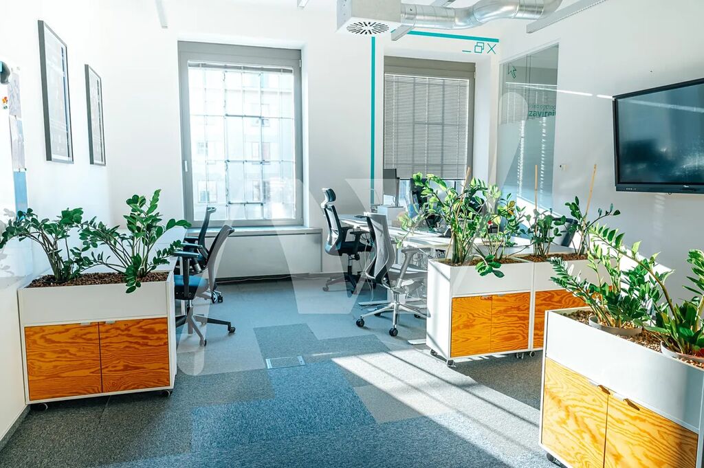 • dispozice zahrnuje 4 velké kanceláře (každá pro až 10 osob), další velkou kancelář, prostornou zasedačku pro 12-16 osob, 2 zasedačky (pro 4 osoby), kuchyňku vybavenou spotřebiči