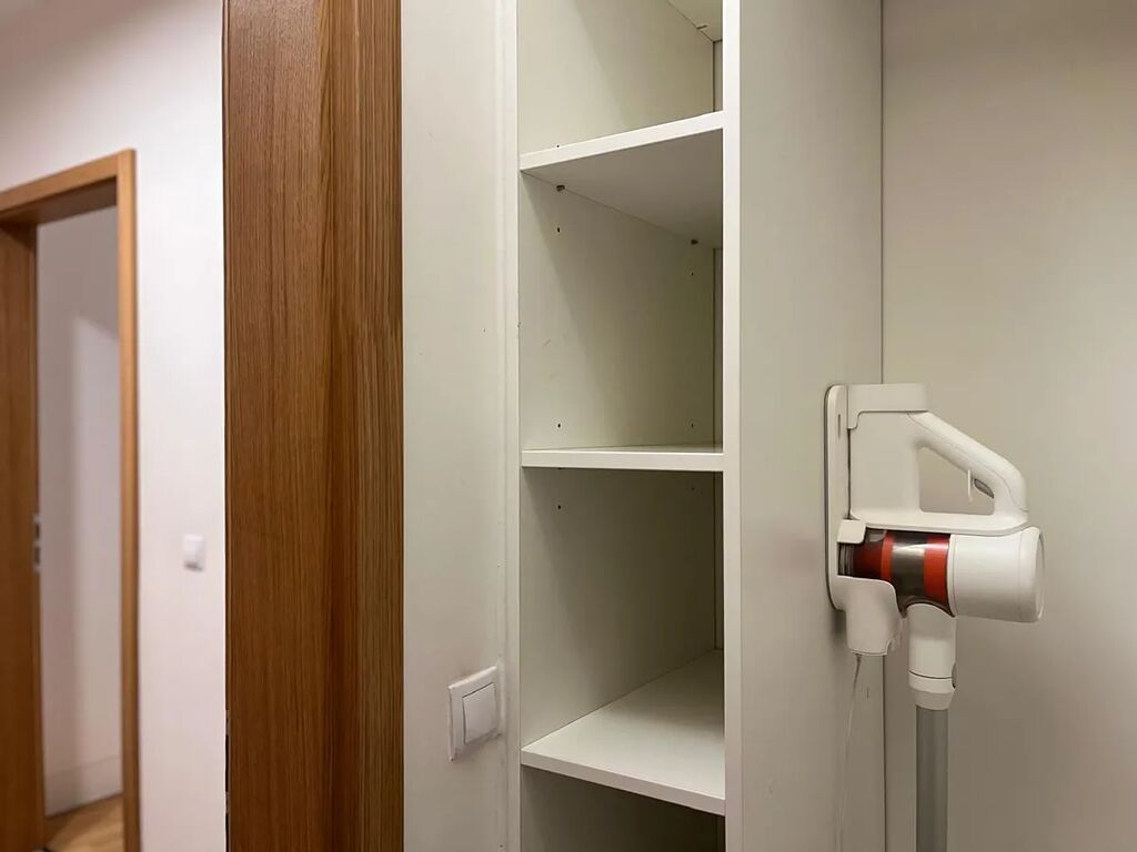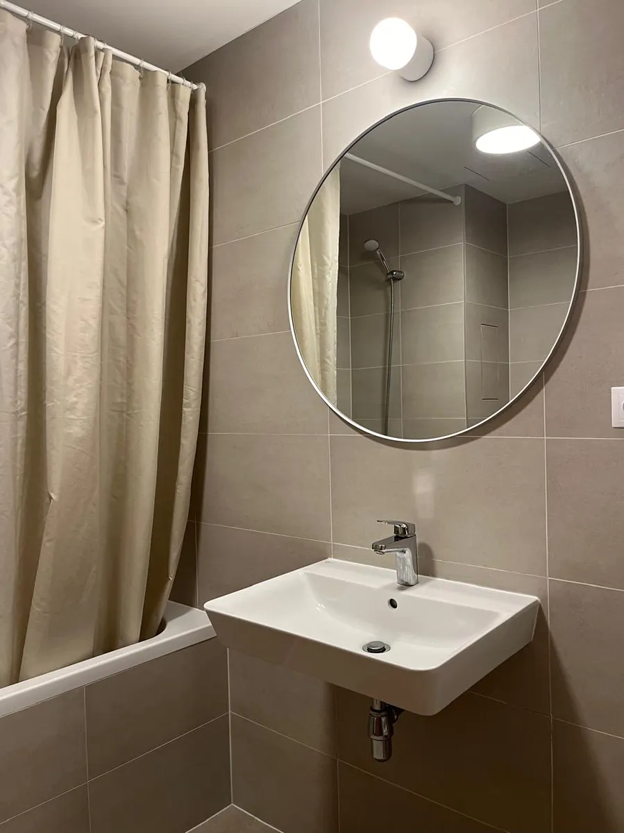 Koupelna je vybavena vanou, umyvadlem, úložnou skříní a pračkou. Toaleta je součástí koupelny. V předsíni je umístěno zrcadlo a věšákový prostor.
