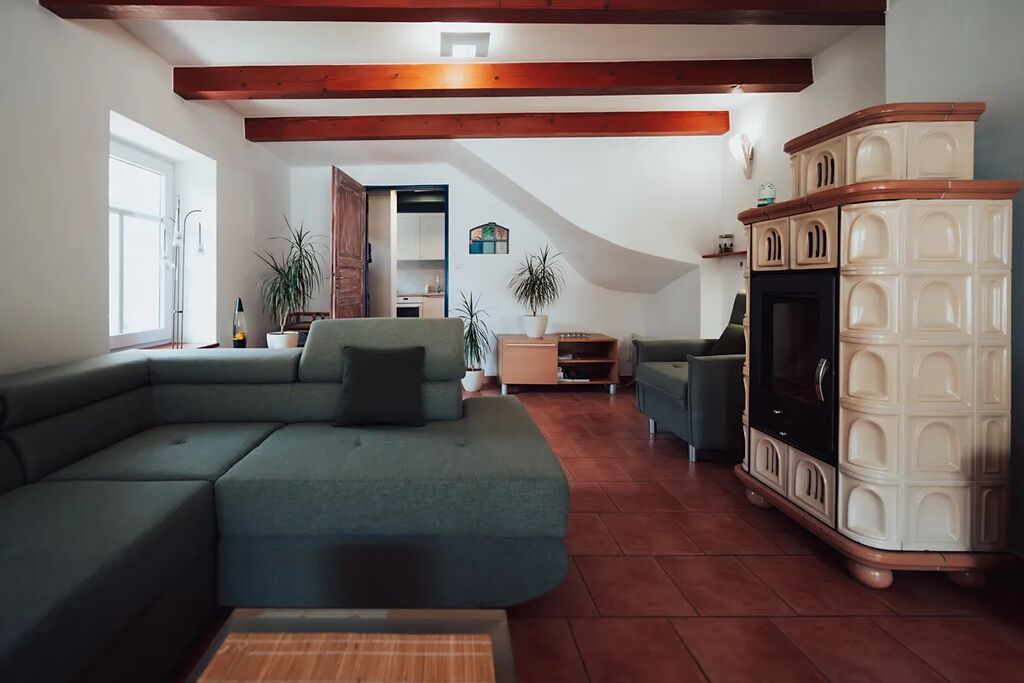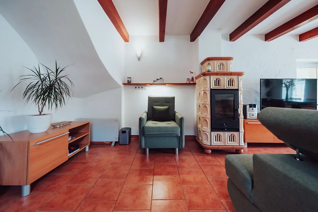 Topení: krbová kamna a infrapanel.