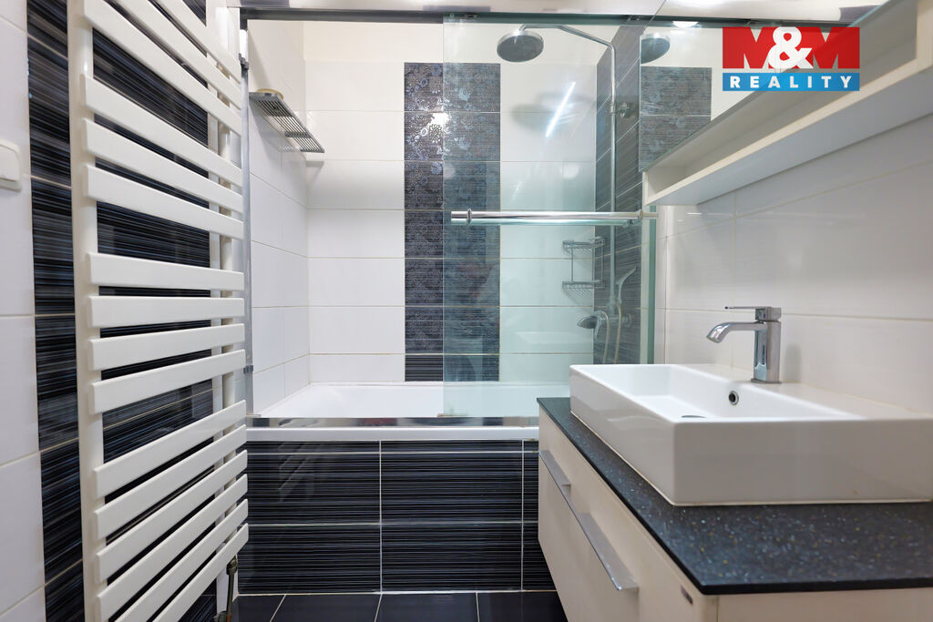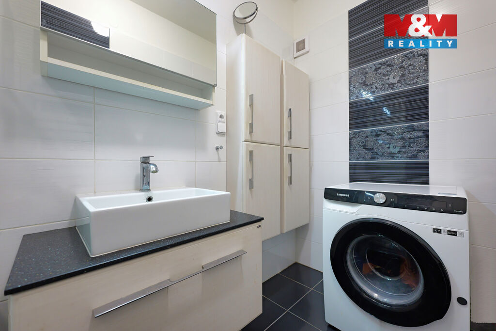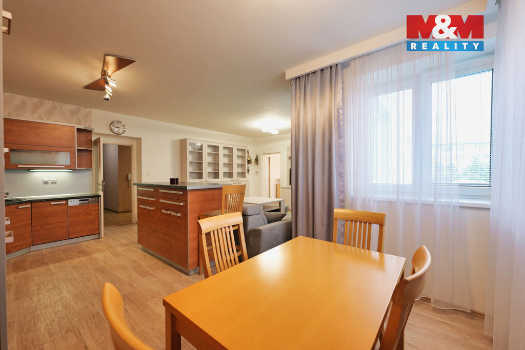 Interiér tvoří kuchyň s linkou na míru se spotřebiči (plynová deska, el. trouba, mikrovlnná trouba, lednice, myčka) a kuchyňským ostrůvkem navazujícím na obývací část se sedačkou, knihovnami a jídelním koutem. Další dva pokoje jsou samostatně přístupné i vzájemně průchozí. K dispozici je prostorná komora, šatna, koupelna s vanou a sprchovou zástěnou, samostatné WC.