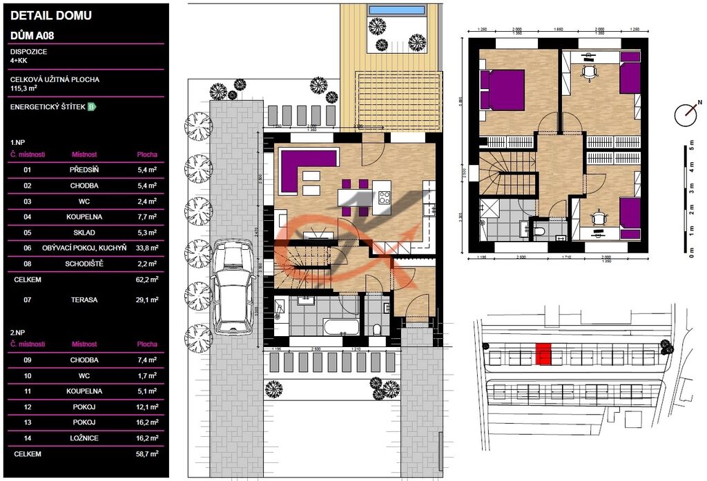 Prodej řadového rodinného domu o zastavěné ploše 84m2 s pozemkem včetně zastavěné plochy 197m2, RD 08. Jedná se o dvoupodlažní skeletový dům o dispozici 4+kk , celková užitná plocha 116,3m2. Dům je situován na ulici Holešovská v nově vznikající lokalitě. V první fázi bude postaveno jedenáct rodinným domů, následně výstavba dalších šesti domů. V přízemí domu se nachází vstupní chodba, centrální chodba se schodištěm do patra domu, koupelna s vanou, samostatná toaleta, obývací pokoj propojený s kuchyní o výměře 34,8m2, z obývacího pokoje je vstup na venkovní terasu, pod schodištěm je komora. V patře domu jsou tři prostorné pokoje, dva o velikosti 16m2 a jeden 12m2, koupelna se sprchovým koutem, samostatná toaleta, prostorná chodba. V domě bude elektrické podlahové vytápění, příprava pro instalaci krbových kamen a vývod pro externí komín. Střešní krytina - plechové šablony, okna plastová trojskla, podlahy linoleum, vnitřní dveře včetně obložek, bojler pro ohřev teplé vody, koupelny budou vybaveny obklady, dlažbou a veškerou sanitou. Příjezd k domu bude řešen zámkovou dlažbou, což umožní vznik parkovacích stání podél domu. Dům bude napojen na veřejný vodovodní řád a kanalizaci, přístup bude zajištěn z obecní komunikace. Dům se nachází přibližně 900m od centra Fryštáku a 8 km (cca 15 minut autem) od Zlína. Dům je ve výstavbě, jeho dokončení je plánováno v prvním kvartálu roku 2026.