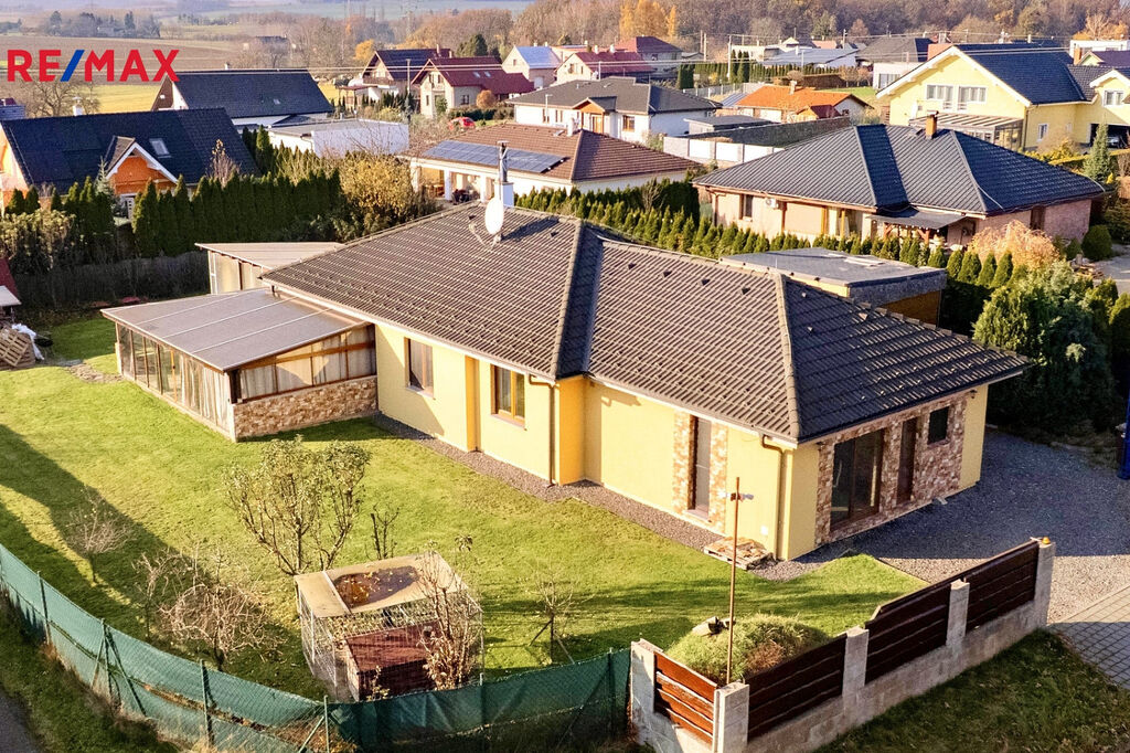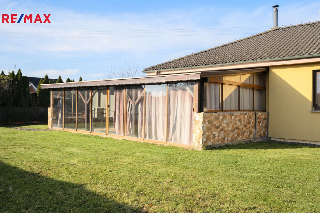 Zděný dům má užitnou plochu 138 m². Dominantou je prostorný obývací pokoj s přímým vstupem na zastřešenou terasu o přibližné velikosti 50 m² nebo ke krytému bazénu o rozměrech 3 × 6 metrů. Bazén se slanou vodou je vyhřívaný tepelným čerpadlem, takže si můžete užít koupání i mimo hlavní sezónu. Tato kombinace vytváří skvělé zázemí pro celoroční relax a soukromí.